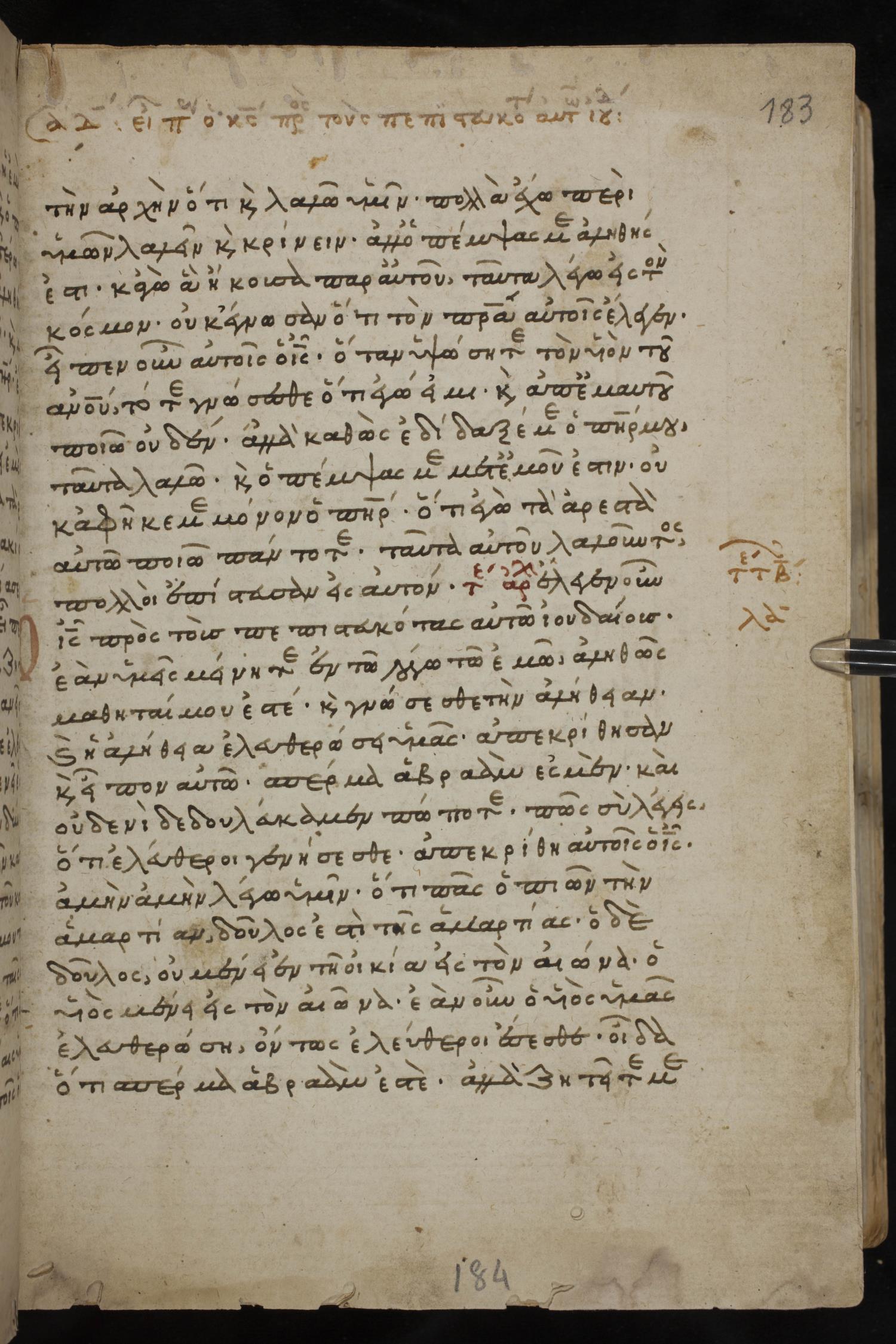 Thirteenth century minuscule of the Gospels, Apostolos, Paul, and Revelation on paper; 412 leaves, 1 column, 24-28 lines per column. Images were taken at the National Library of Greece in Athens.
