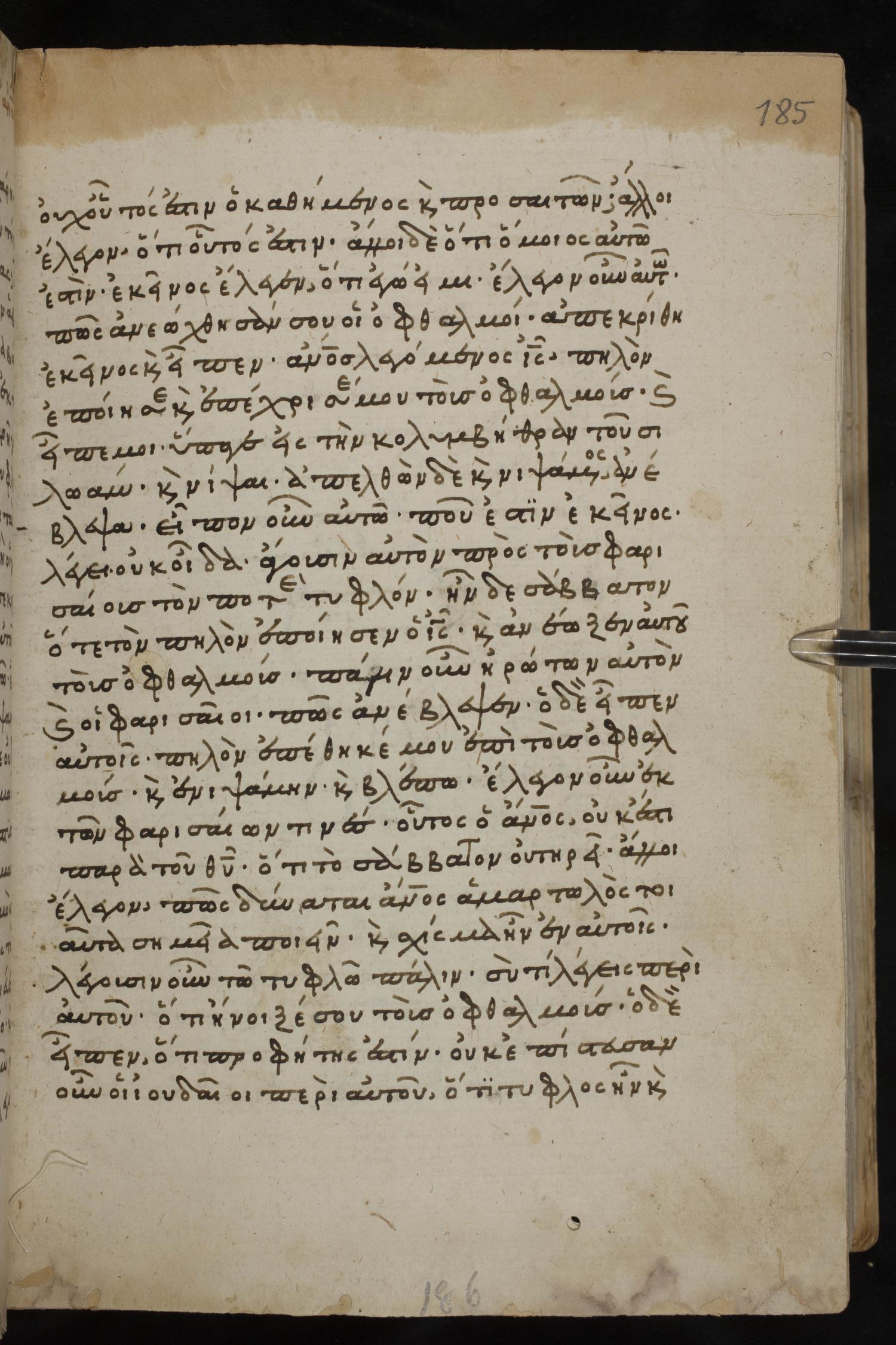 Thirteenth century minuscule of the Gospels, Apostolos, Paul, and Revelation on paper; 412 leaves, 1 column, 24-28 lines per column. Images were taken at the National Library of Greece in Athens.