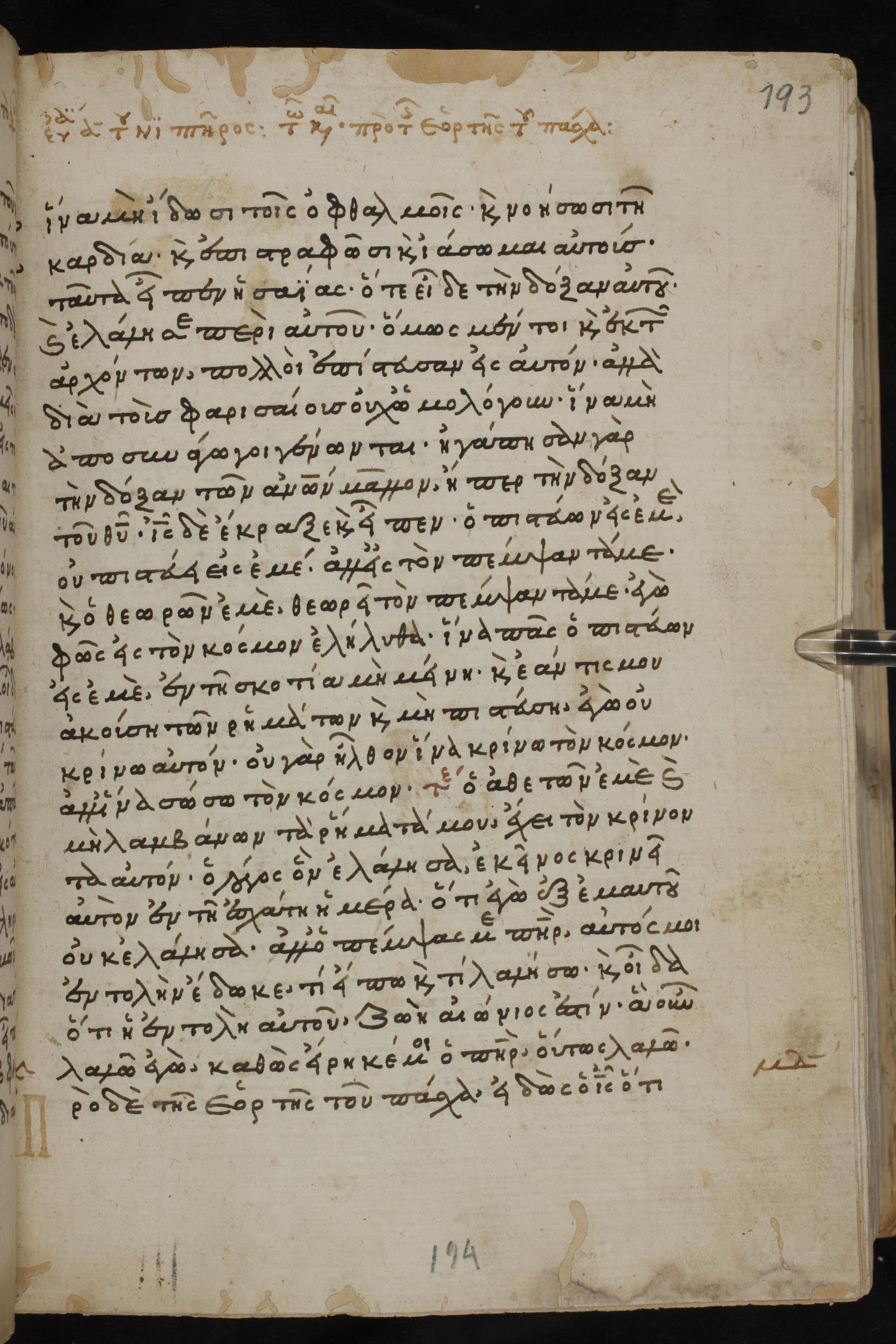 Thirteenth century minuscule of the Gospels, Apostolos, Paul, and Revelation on paper; 412 leaves, 1 column, 24-28 lines per column. Images were taken at the National Library of Greece in Athens.