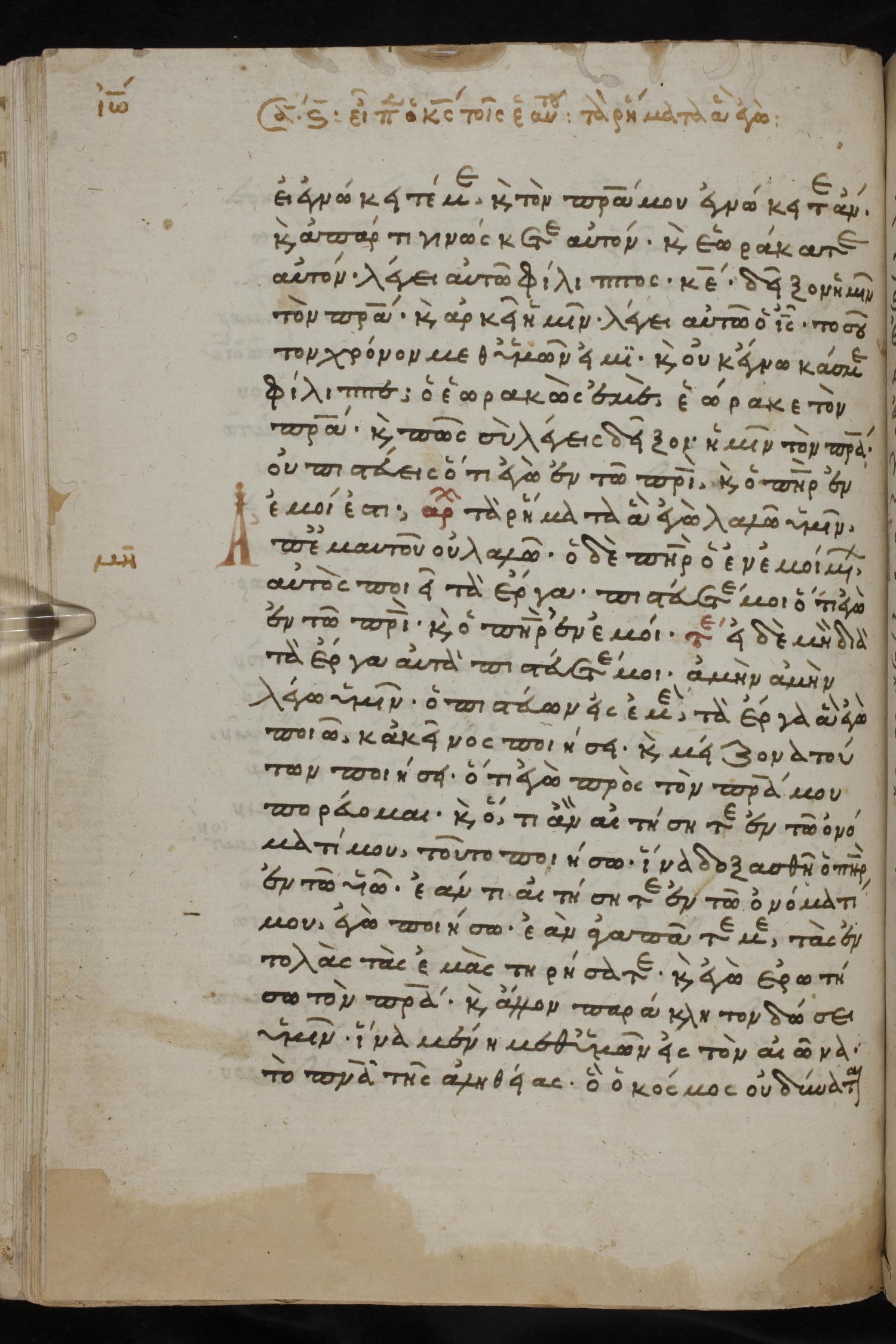 Thirteenth century minuscule of the Gospels, Apostolos, Paul, and Revelation on paper; 412 leaves, 1 column, 24-28 lines per column. Images were taken at the National Library of Greece in Athens.