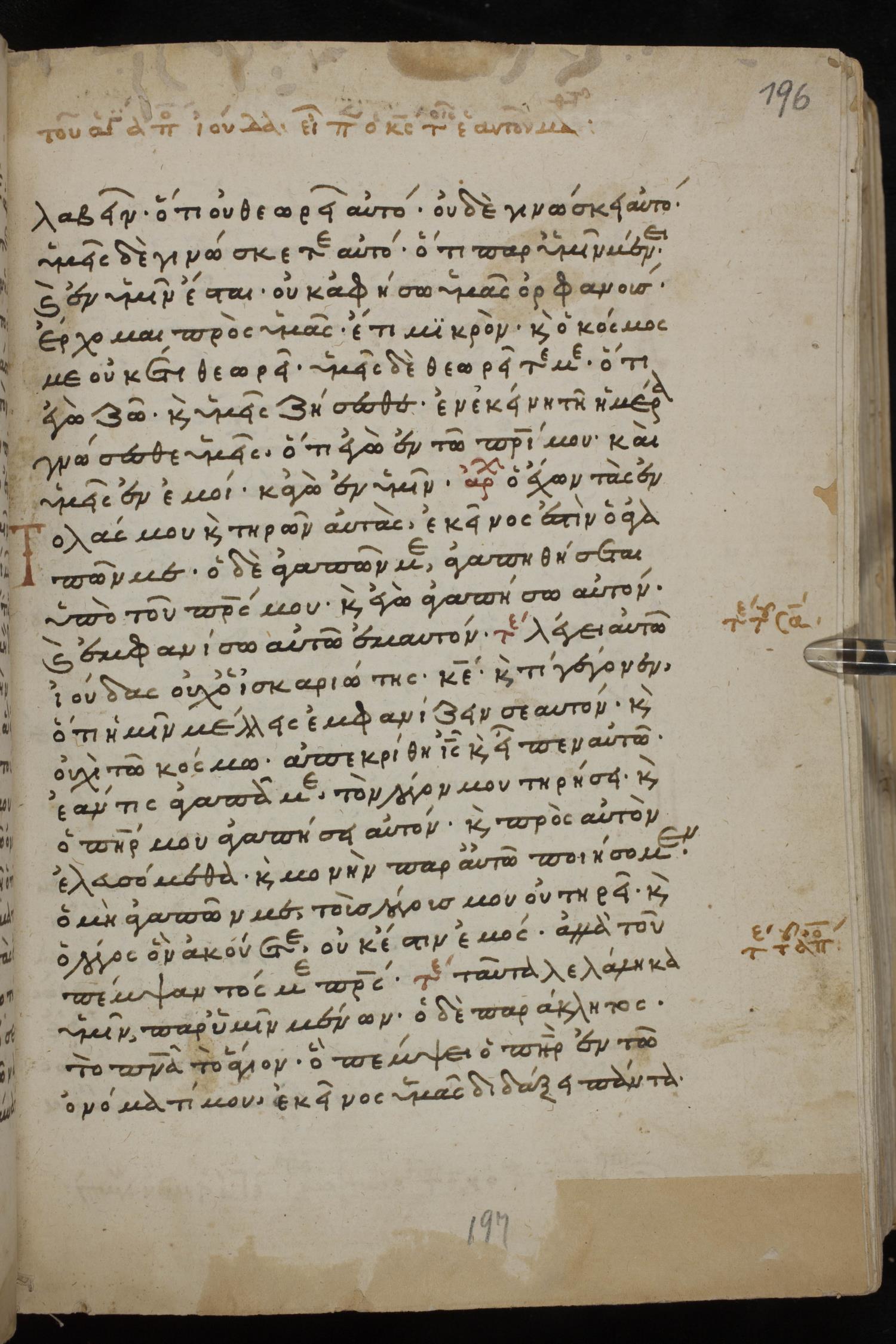 Thirteenth century minuscule of the Gospels, Apostolos, Paul, and Revelation on paper; 412 leaves, 1 column, 24-28 lines per column. Images were taken at the National Library of Greece in Athens.