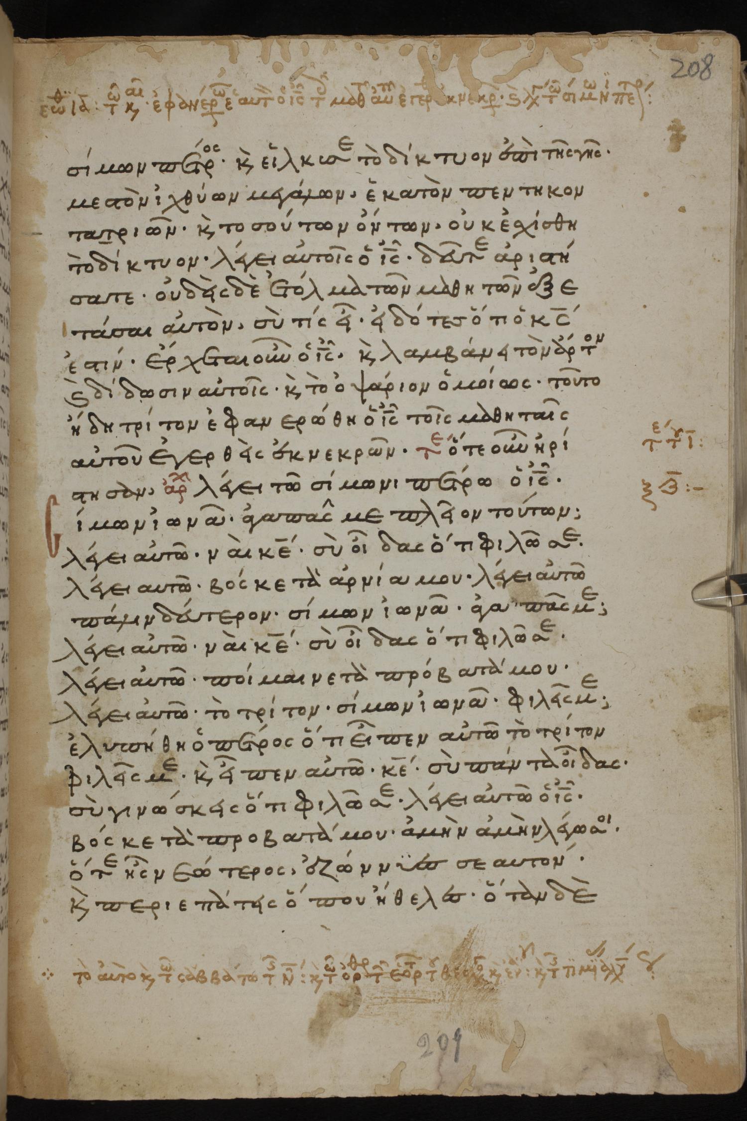 Thirteenth century minuscule of the Gospels, Apostolos, Paul, and Revelation on paper; 412 leaves, 1 column, 24-28 lines per column. Images were taken at the National Library of Greece in Athens.