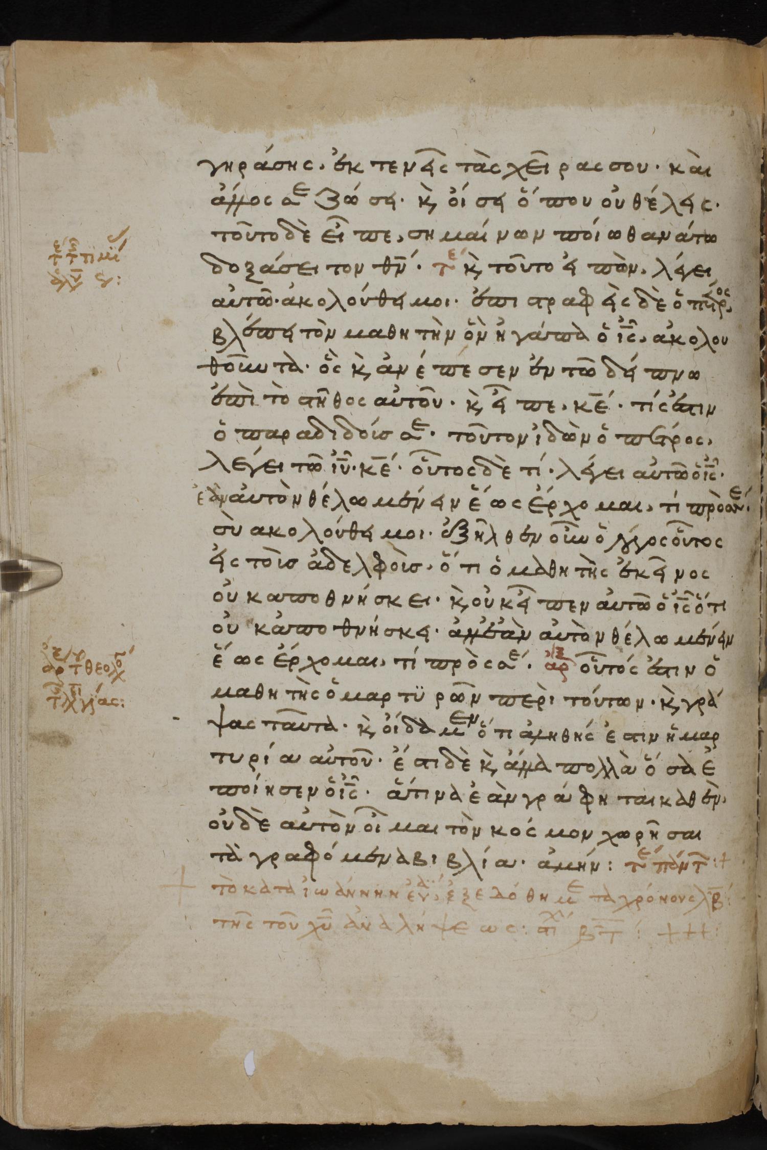 Ἐπιστραφεὶς ὁ Πέτρος βλέπει τὸν μαθητὴν ὃν ἠγάπα ὁ Ἰησοῦς ἀκολουθοῦντα, ὃς καὶ ἀνέπεσεν ἐν τῷ δείπνῳ ἐπὶ τὸ στῆθος αὐτοῦ καὶ εἶπεν Κύριε, τίς ἐστιν ὁ παραδιδούς σε;