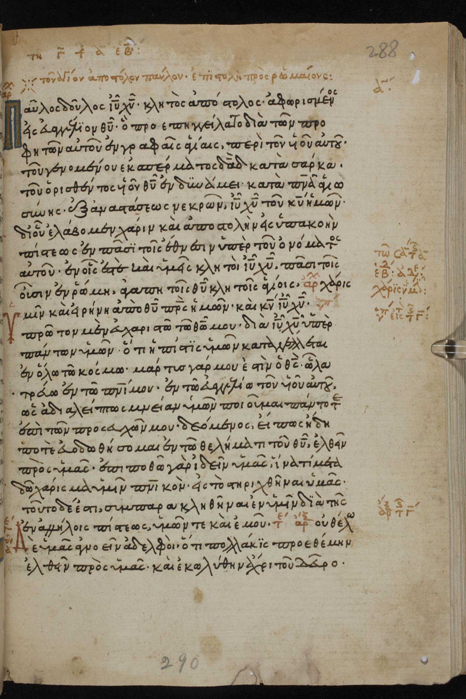 Thirteenth century minuscule of the Gospels, Apostolos, Paul, and Revelation on paper; 412 leaves, 1 column, 24-28 lines per column. Images were taken at the National Library of Greece in Athens.