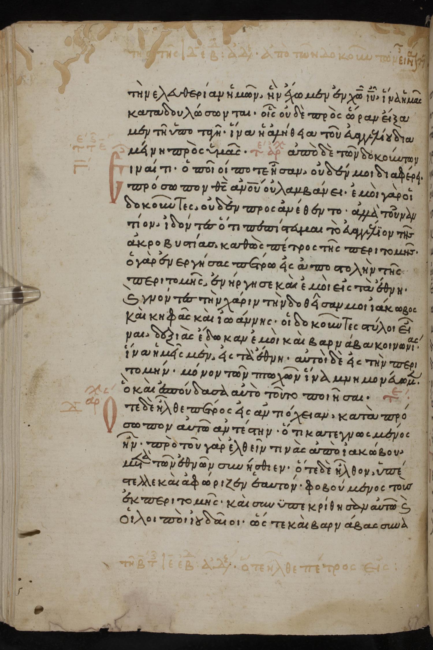 Thirteenth century minuscule of the Gospels, Apostolos, Paul, and Revelation on paper; 412 leaves, 1 column, 24-28 lines per column. Images were taken at the National Library of Greece in Athens.