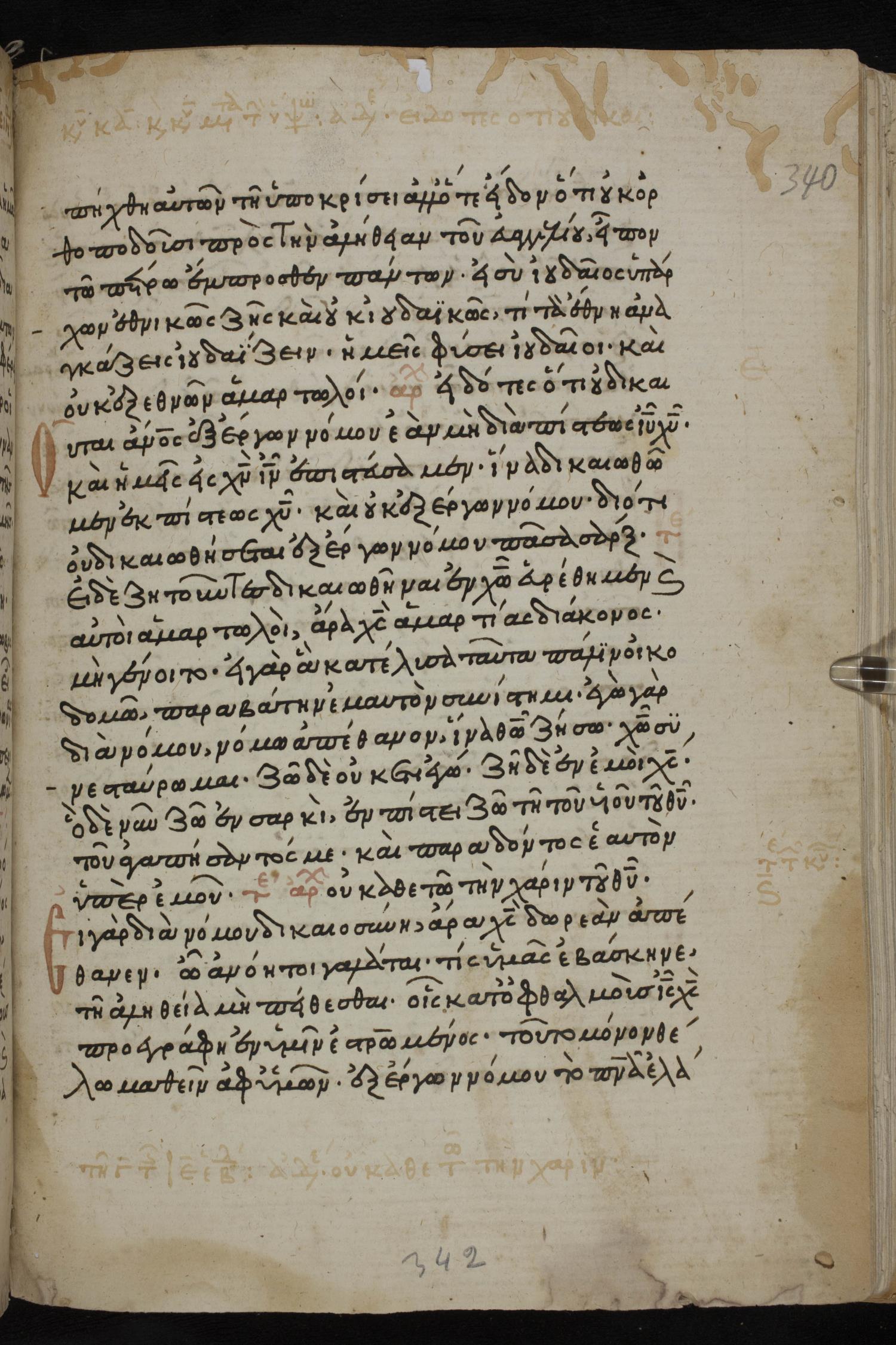 Thirteenth century minuscule of the Gospels, Apostolos, Paul, and Revelation on paper; 412 leaves, 1 column, 24-28 lines per column. Images were taken at the National Library of Greece in Athens.