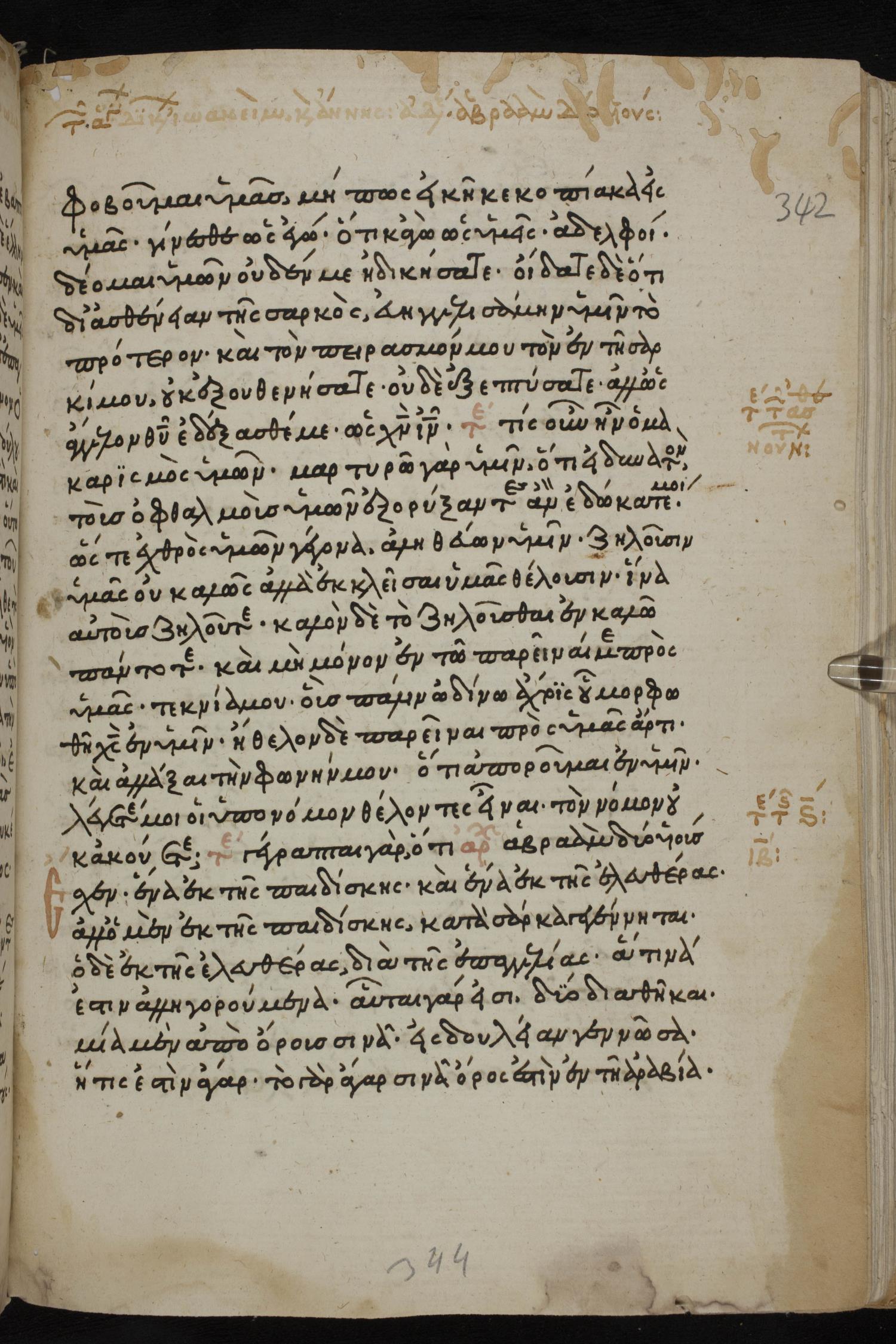 Thirteenth century minuscule of the Gospels, Apostolos, Paul, and Revelation on paper; 412 leaves, 1 column, 24-28 lines per column. Images were taken at the National Library of Greece in Athens.