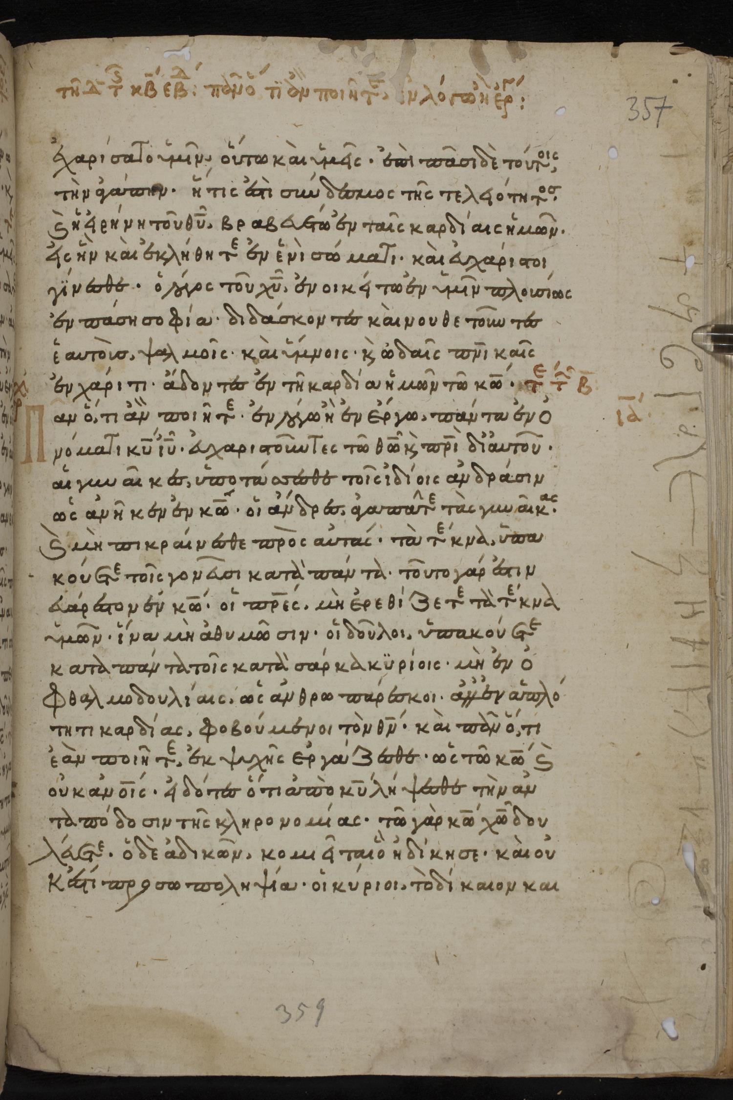 Thirteenth century minuscule of the Gospels, Apostolos, Paul, and Revelation on paper; 412 leaves, 1 column, 24-28 lines per column. Images were taken at the National Library of Greece in Athens.