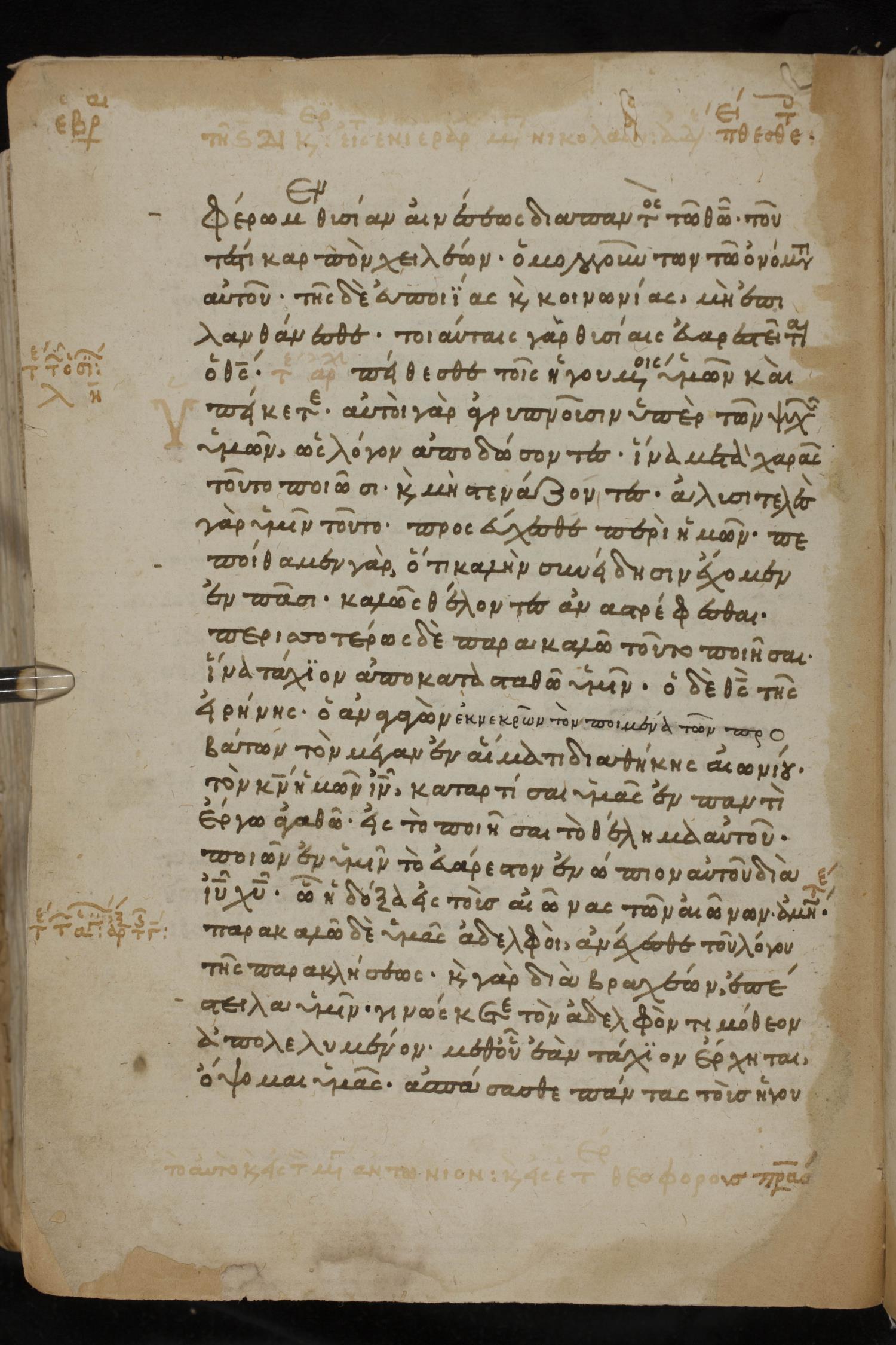 Thirteenth century minuscule of the Gospels, Apostolos, Paul, and Revelation on paper; 412 leaves, 1 column, 24-28 lines per column. Images were taken at the National Library of Greece in Athens.