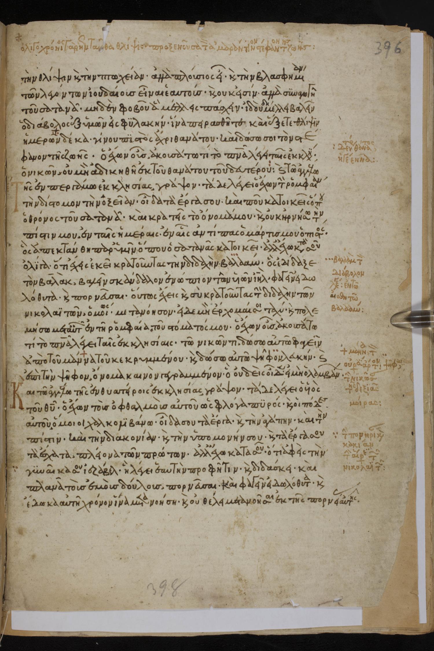Thirteenth century minuscule of the Gospels, Apostolos, Paul, and Revelation on paper; 412 leaves, 1 column, 24-28 lines per column. Images were taken at the National Library of Greece in Athens.