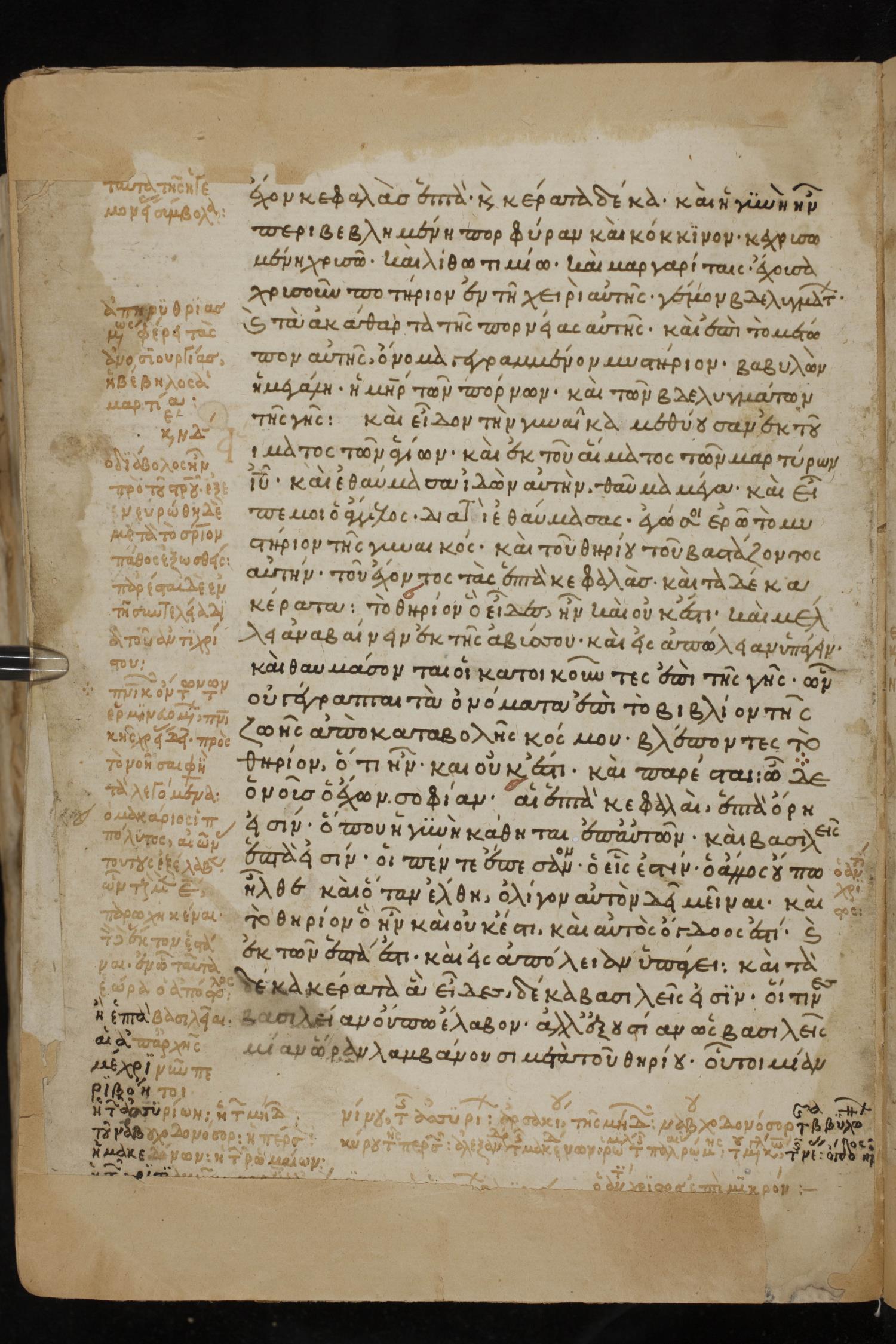 Thirteenth century minuscule of the Gospels, Apostolos, Paul, and Revelation on paper; 412 leaves, 1 column, 24-28 lines per column. Images were taken at the National Library of Greece in Athens.