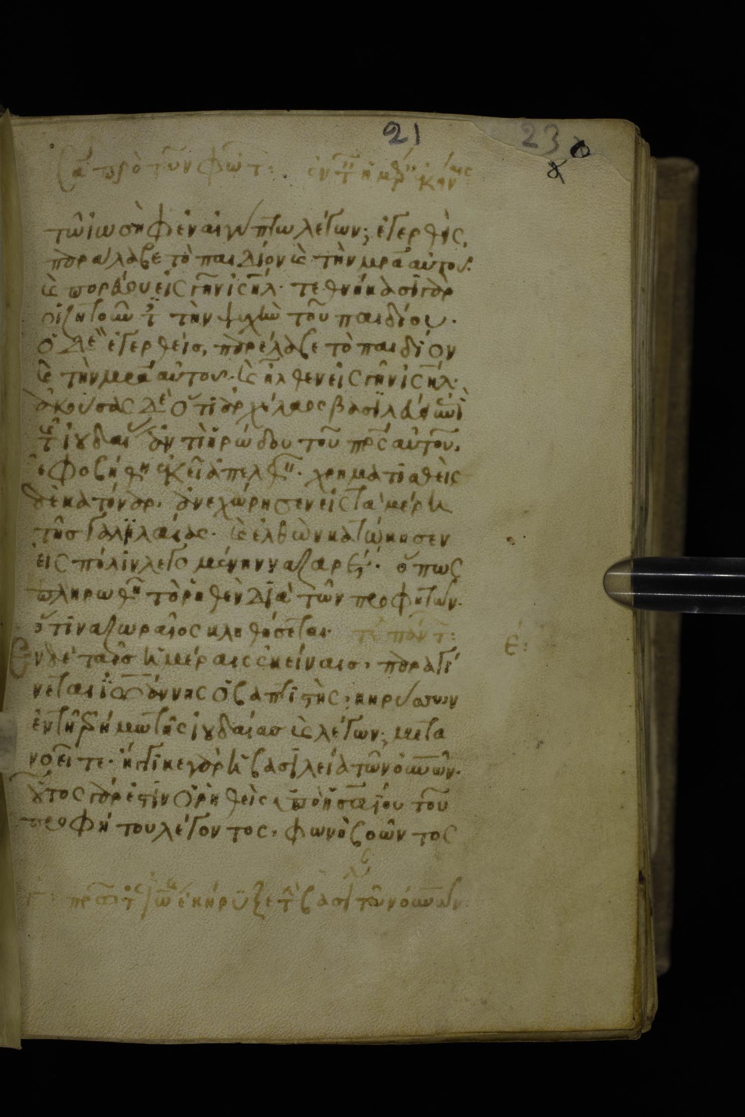 Fourteenth century minuscule of the Gospels on parchment; 302 leaves, 1 column, 19-21 lines per column. Images were taken at the National Library of Greece in Athens.