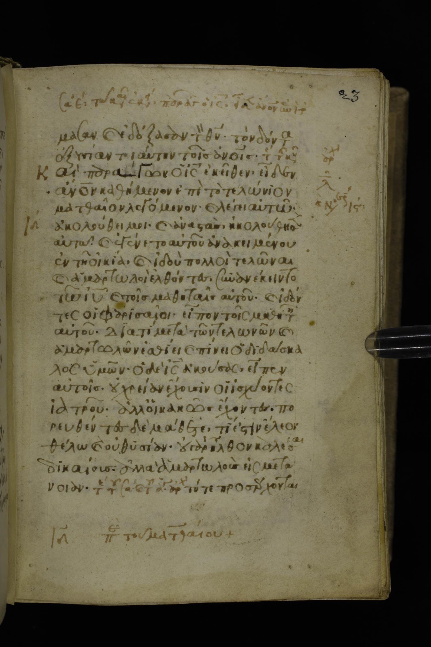 Fourteenth century minuscule of the Gospels on parchment; 302 leaves, 1 column, 19-21 lines per column. Images were taken at the National Library of Greece in Athens.