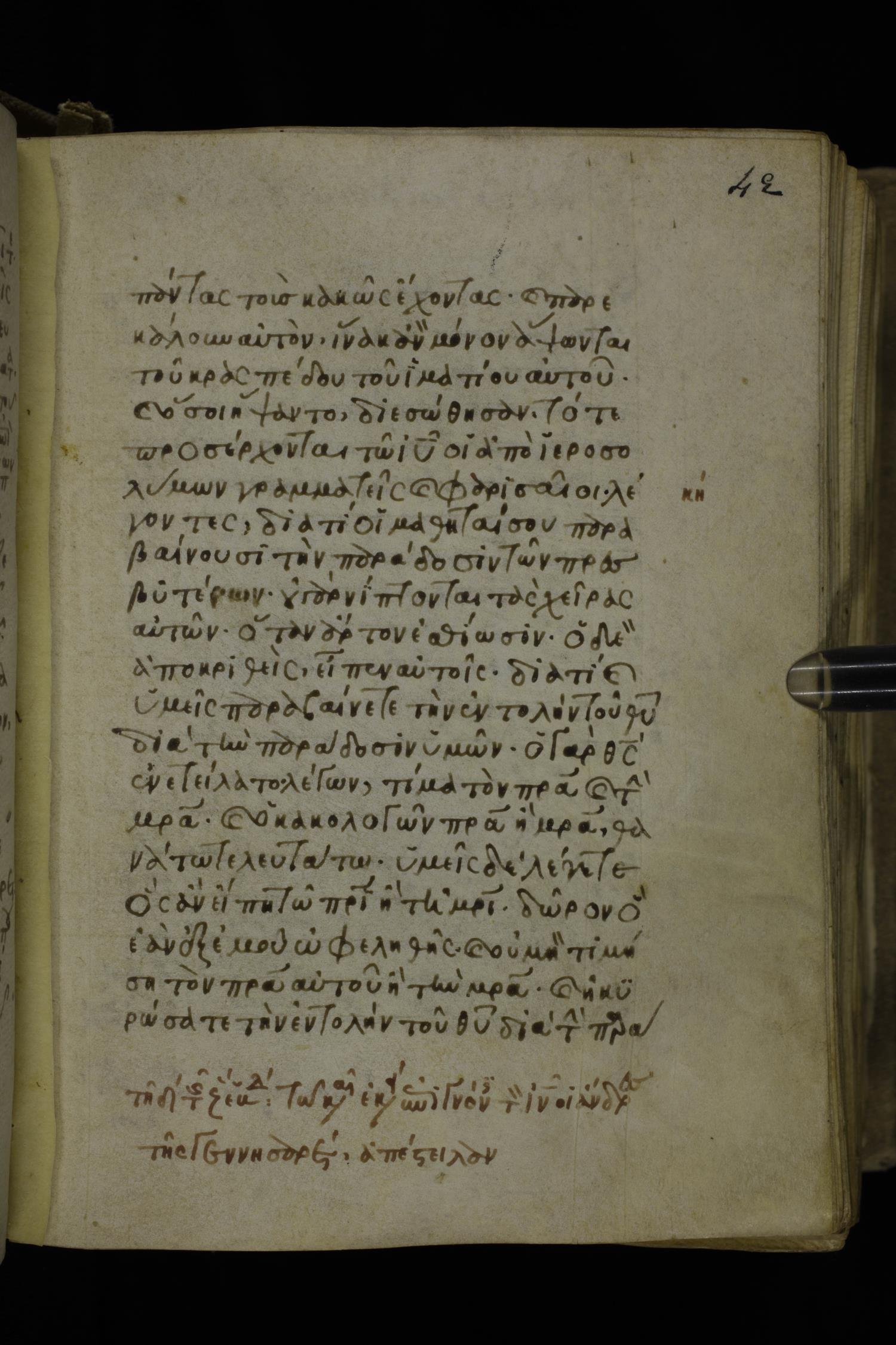 Fourteenth century minuscule of the Gospels on parchment; 302 leaves, 1 column, 19-21 lines per column. Images were taken at the National Library of Greece in Athens.