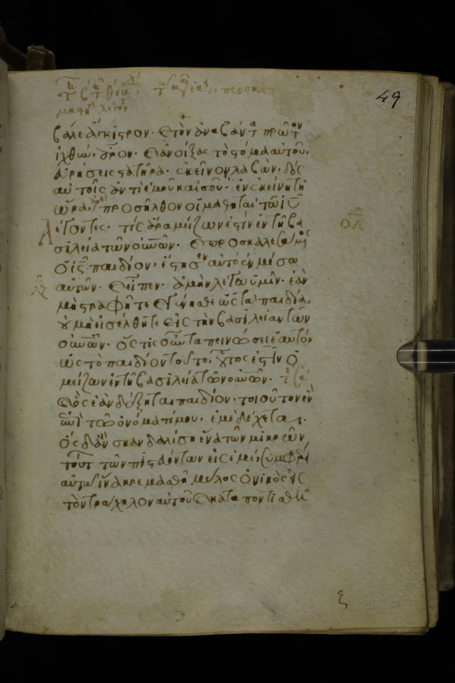 Fourteenth century minuscule of the Gospels on parchment; 302 leaves, 1 column, 19-21 lines per column. Images were taken at the National Library of Greece in Athens.