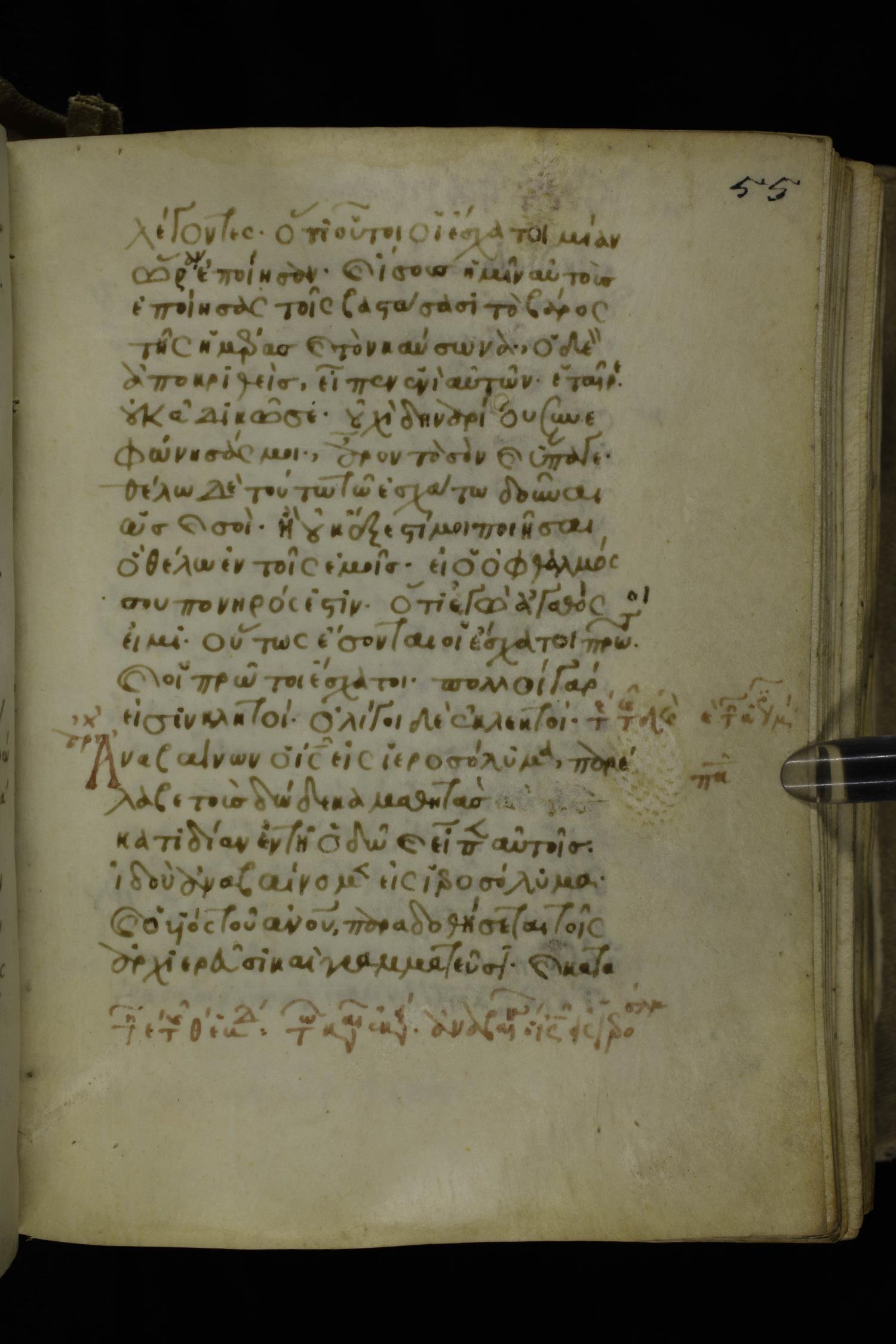 Fourteenth century minuscule of the Gospels on parchment; 302 leaves, 1 column, 19-21 lines per column. Images were taken at the National Library of Greece in Athens.