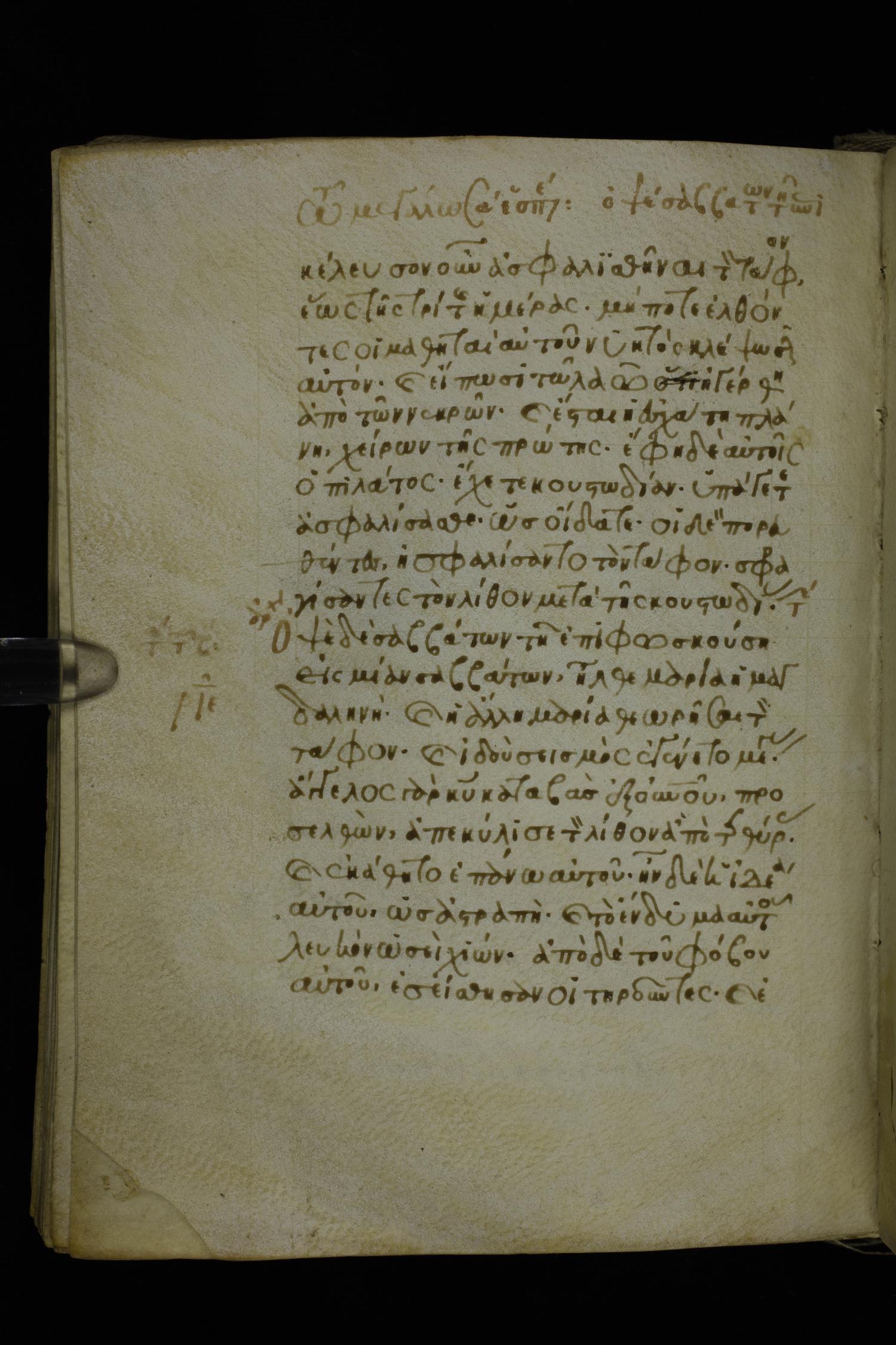 Fourteenth century minuscule of the Gospels on parchment; 302 leaves, 1 column, 19-21 lines per column. Images were taken at the National Library of Greece in Athens.