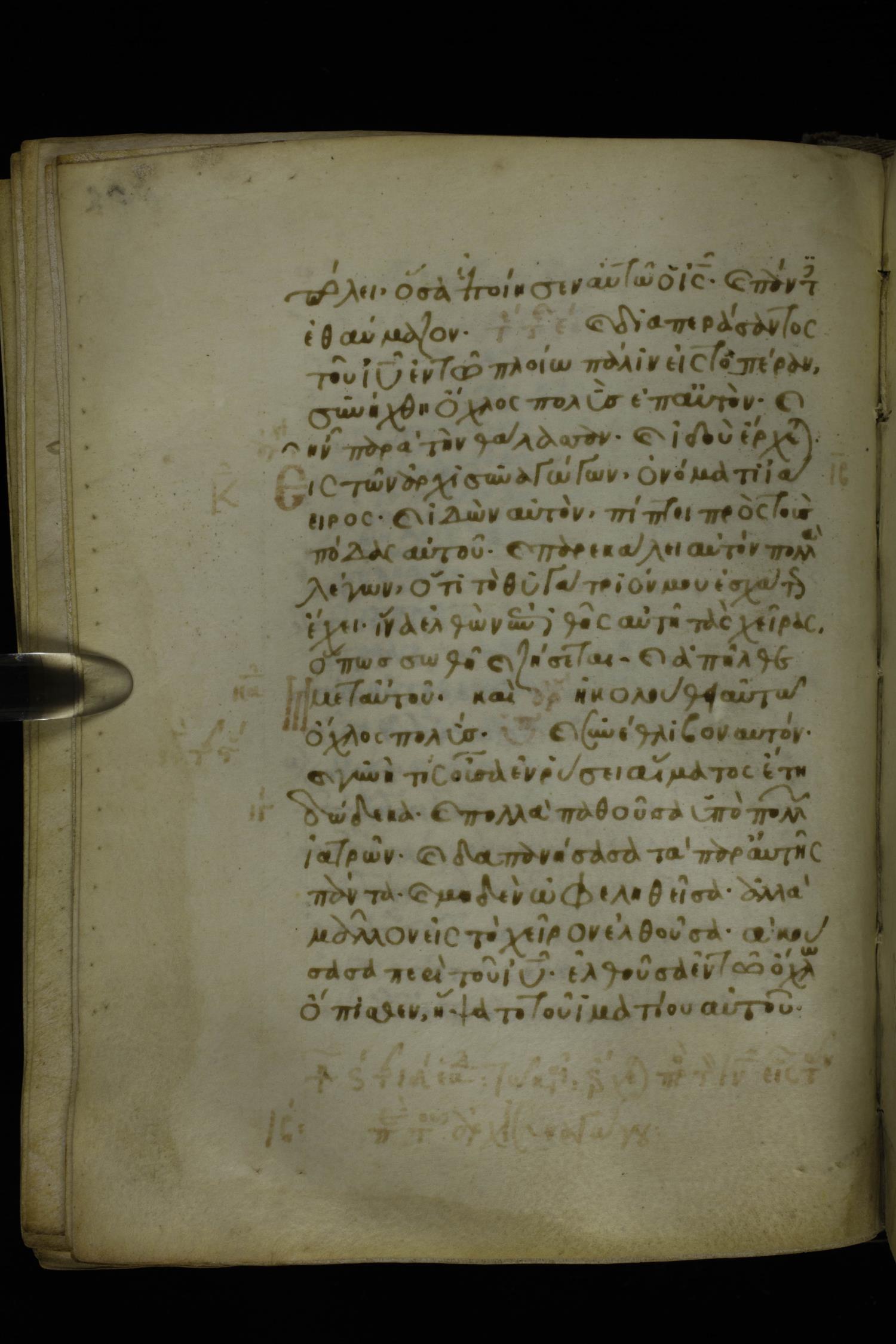 Fourteenth century minuscule of the Gospels on parchment; 302 leaves, 1 column, 19-21 lines per column. Images were taken at the National Library of Greece in Athens.