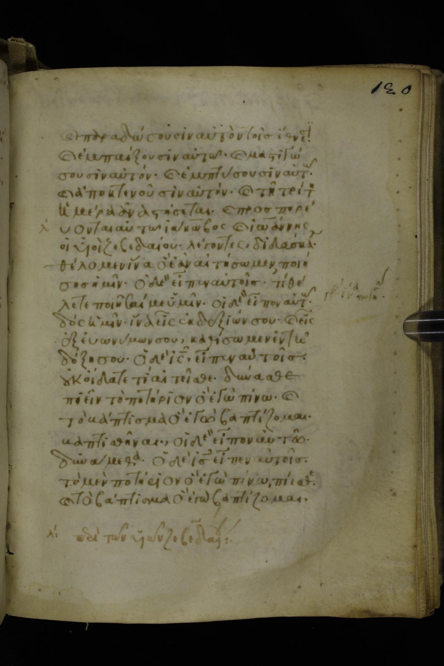 Fourteenth century minuscule of the Gospels on parchment; 302 leaves, 1 column, 19-21 lines per column. Images were taken at the National Library of Greece in Athens.