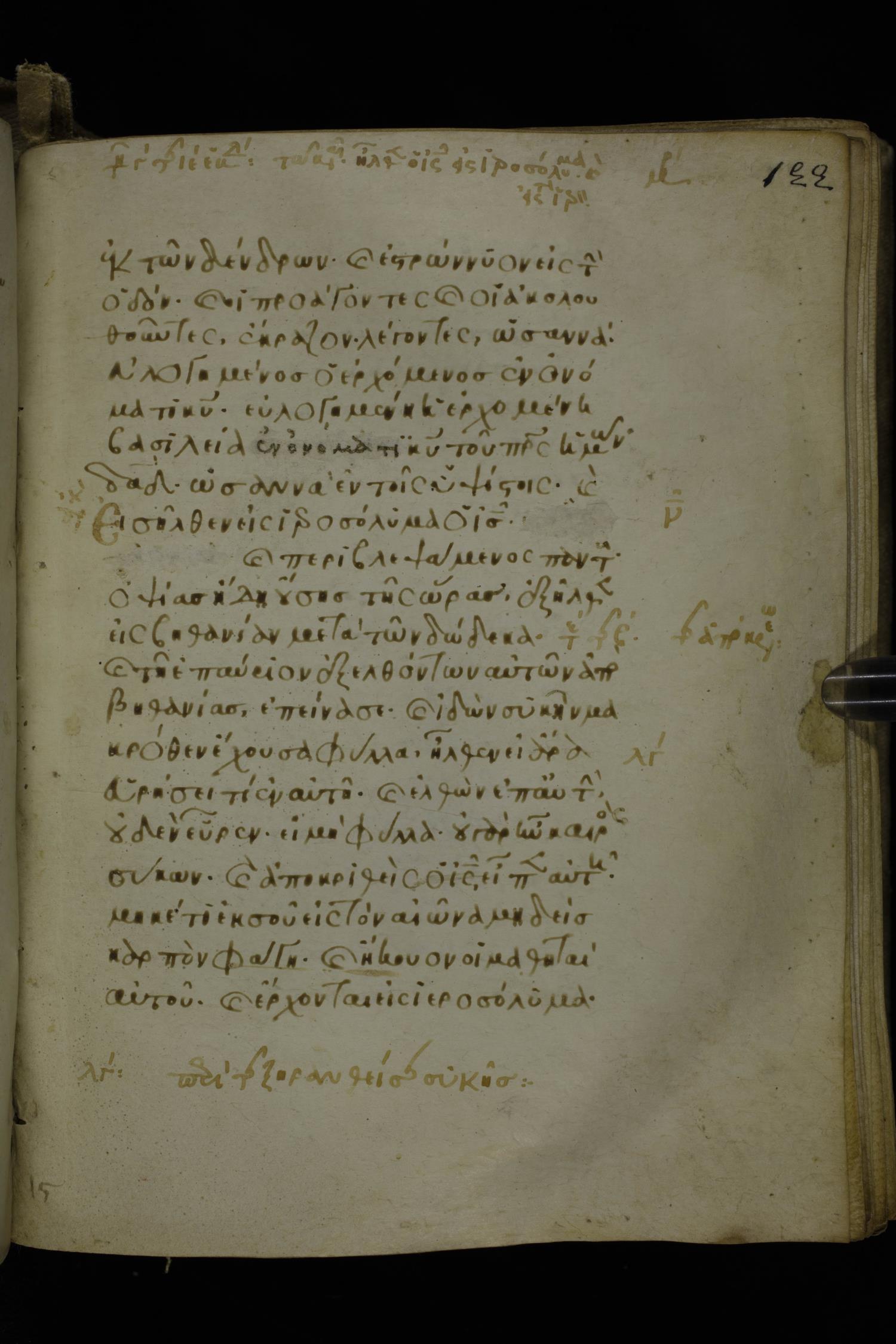 Fourteenth century minuscule of the Gospels on parchment; 302 leaves, 1 column, 19-21 lines per column. Images were taken at the National Library of Greece in Athens.