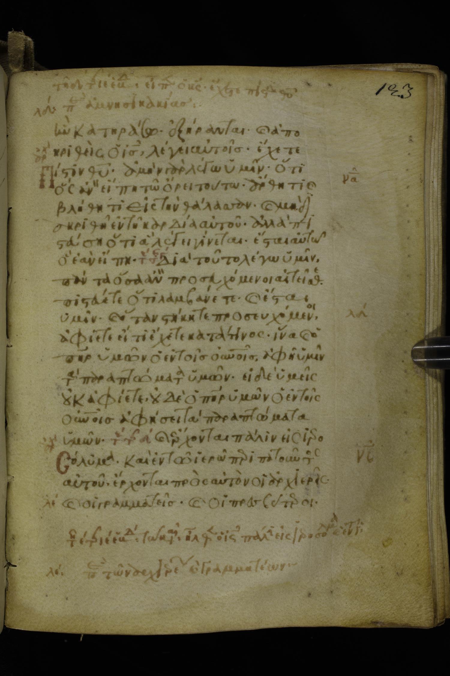 Fourteenth century minuscule of the Gospels on parchment; 302 leaves, 1 column, 19-21 lines per column. Images were taken at the National Library of Greece in Athens.