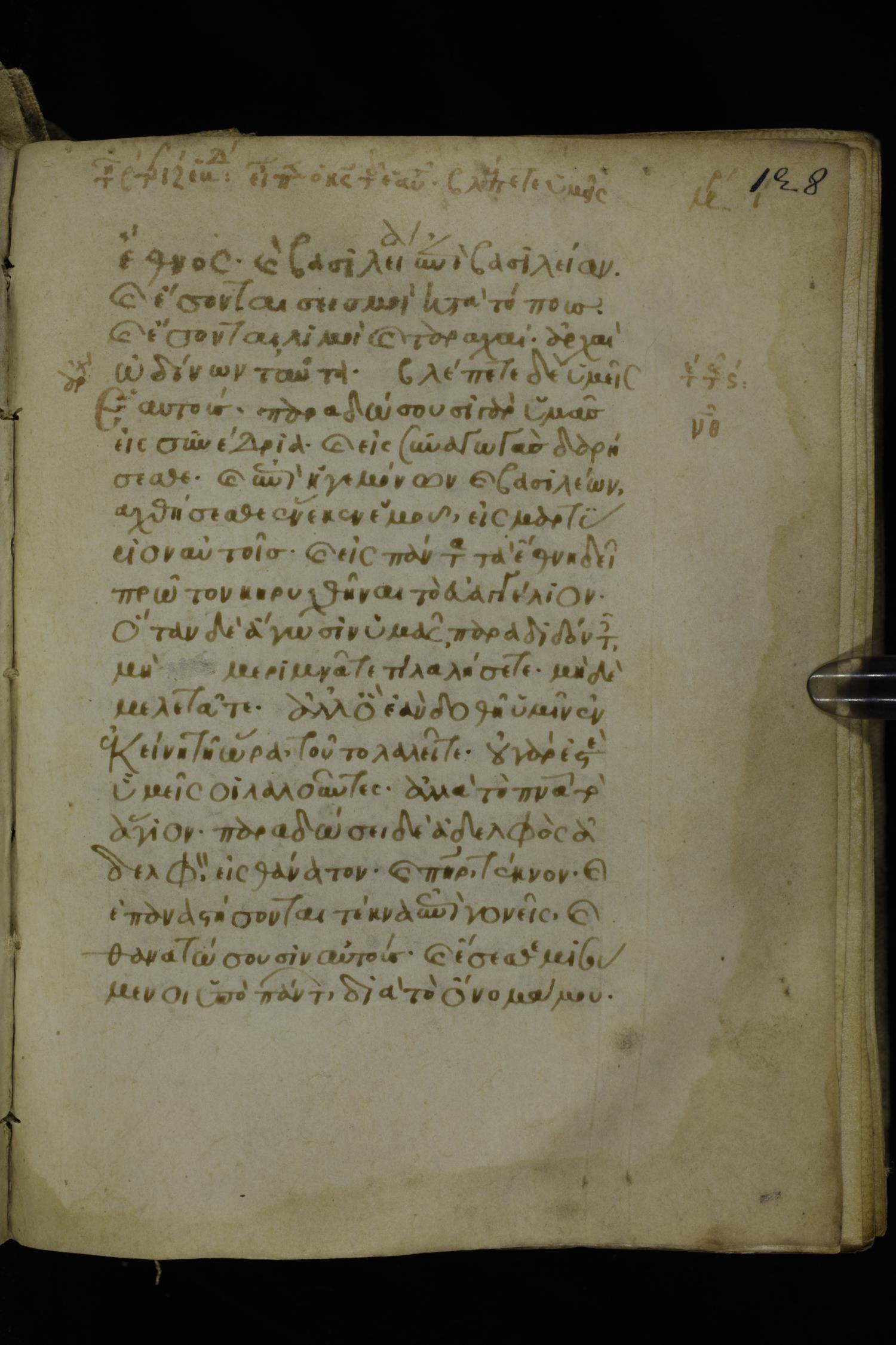 Fourteenth century minuscule of the Gospels on parchment; 302 leaves, 1 column, 19-21 lines per column. Images were taken at the National Library of Greece in Athens.