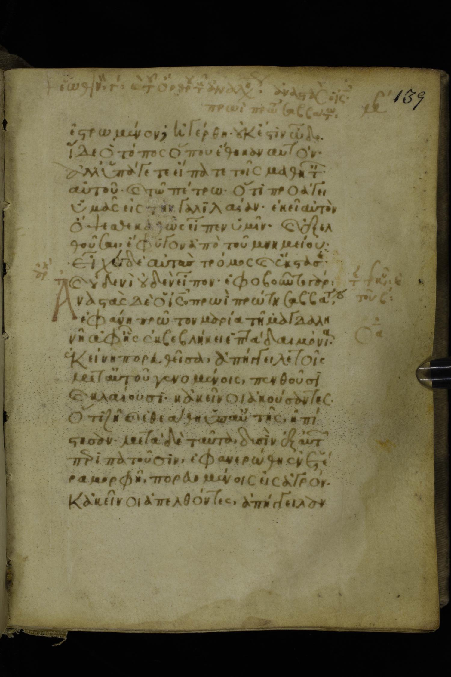 Fourteenth century minuscule of the Gospels on parchment; 302 leaves, 1 column, 19-21 lines per column. Images were taken at the National Library of Greece in Athens.
