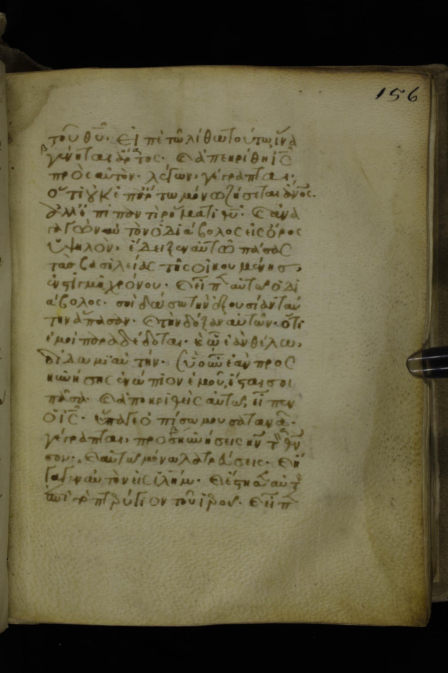Fourteenth century minuscule of the Gospels on parchment; 302 leaves, 1 column, 19-21 lines per column. Images were taken at the National Library of Greece in Athens.