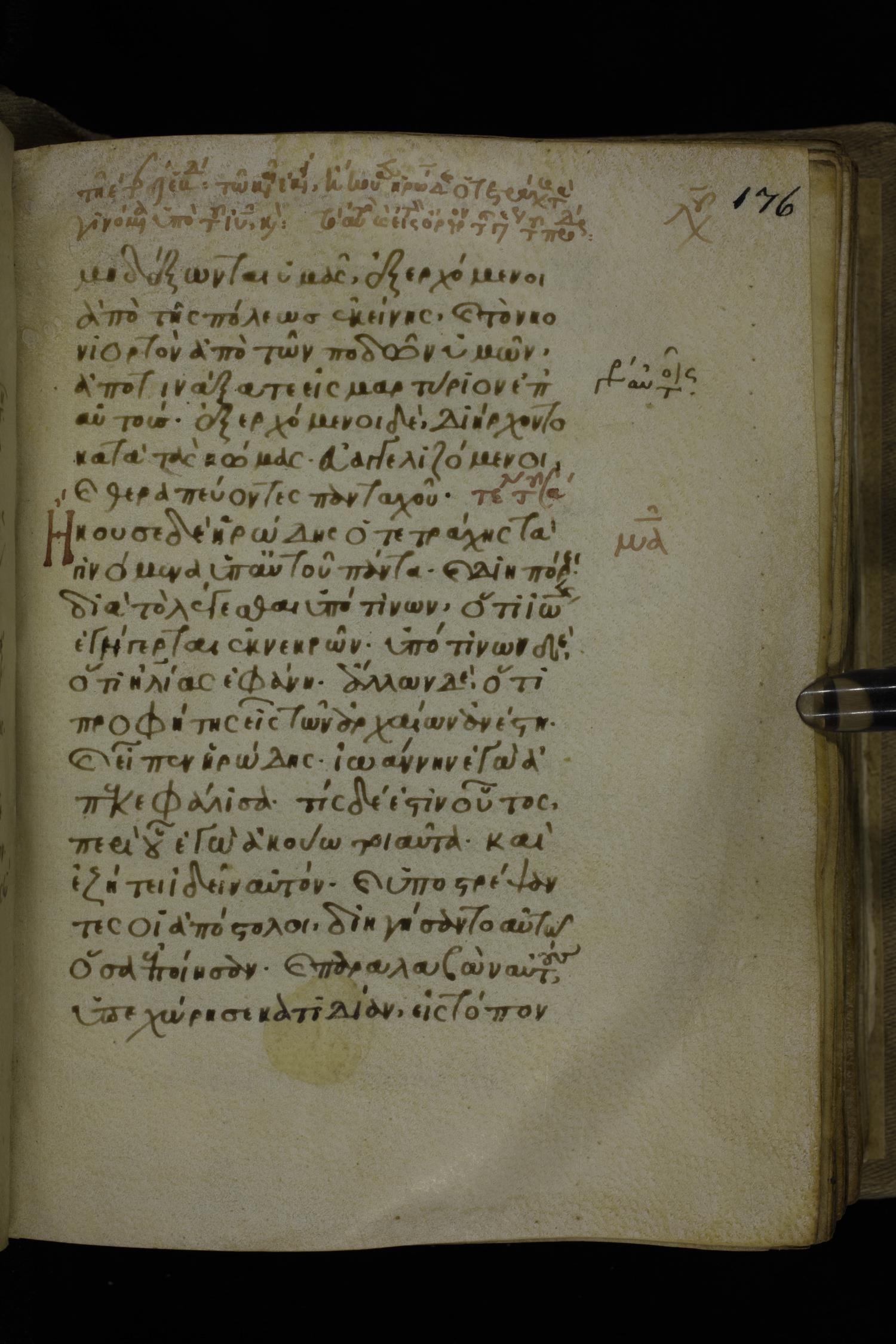 Fourteenth century minuscule of the Gospels on parchment; 302 leaves, 1 column, 19-21 lines per column. Images were taken at the National Library of Greece in Athens.
