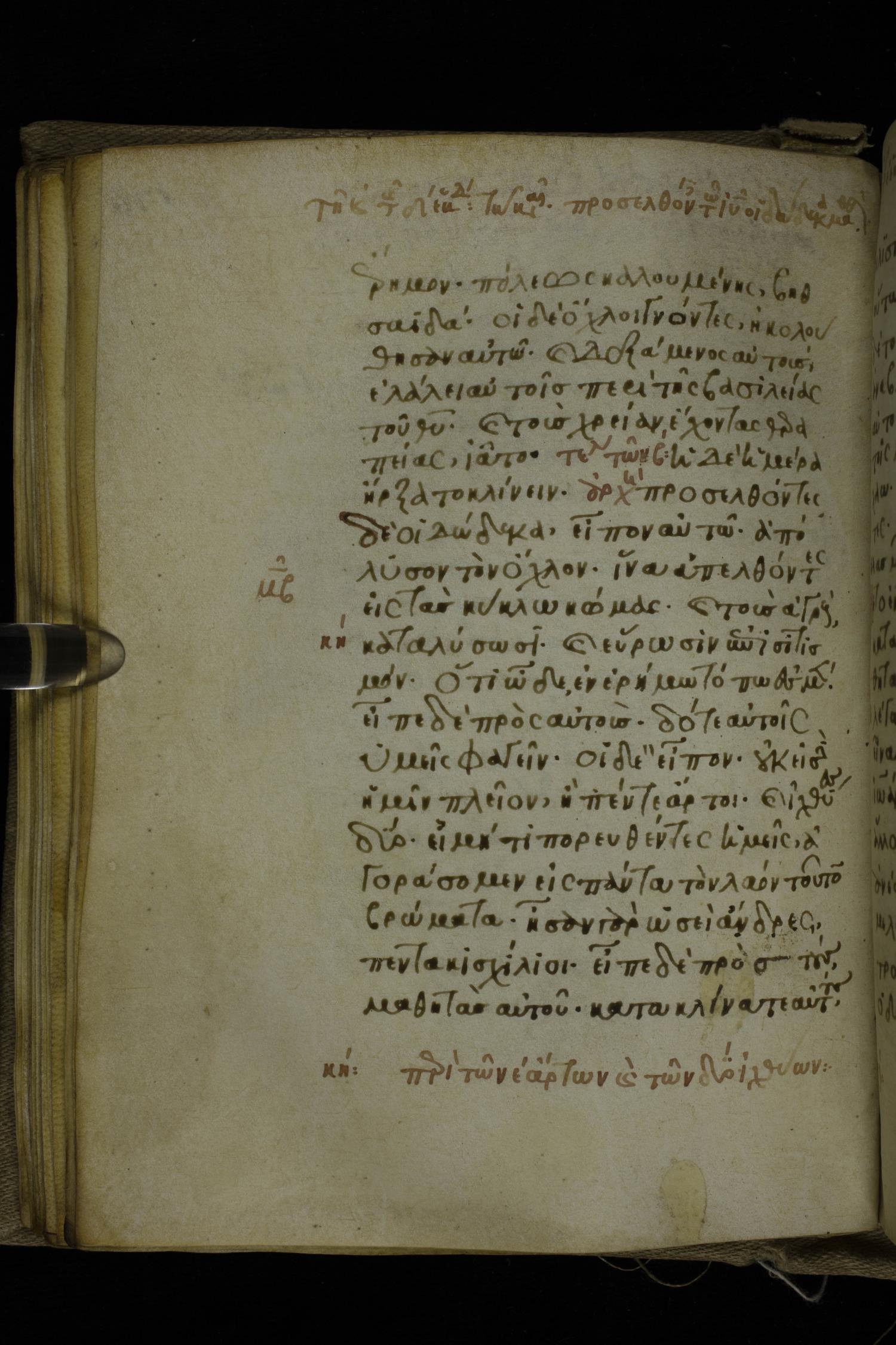 Fourteenth century minuscule of the Gospels on parchment; 302 leaves, 1 column, 19-21 lines per column. Images were taken at the National Library of Greece in Athens.