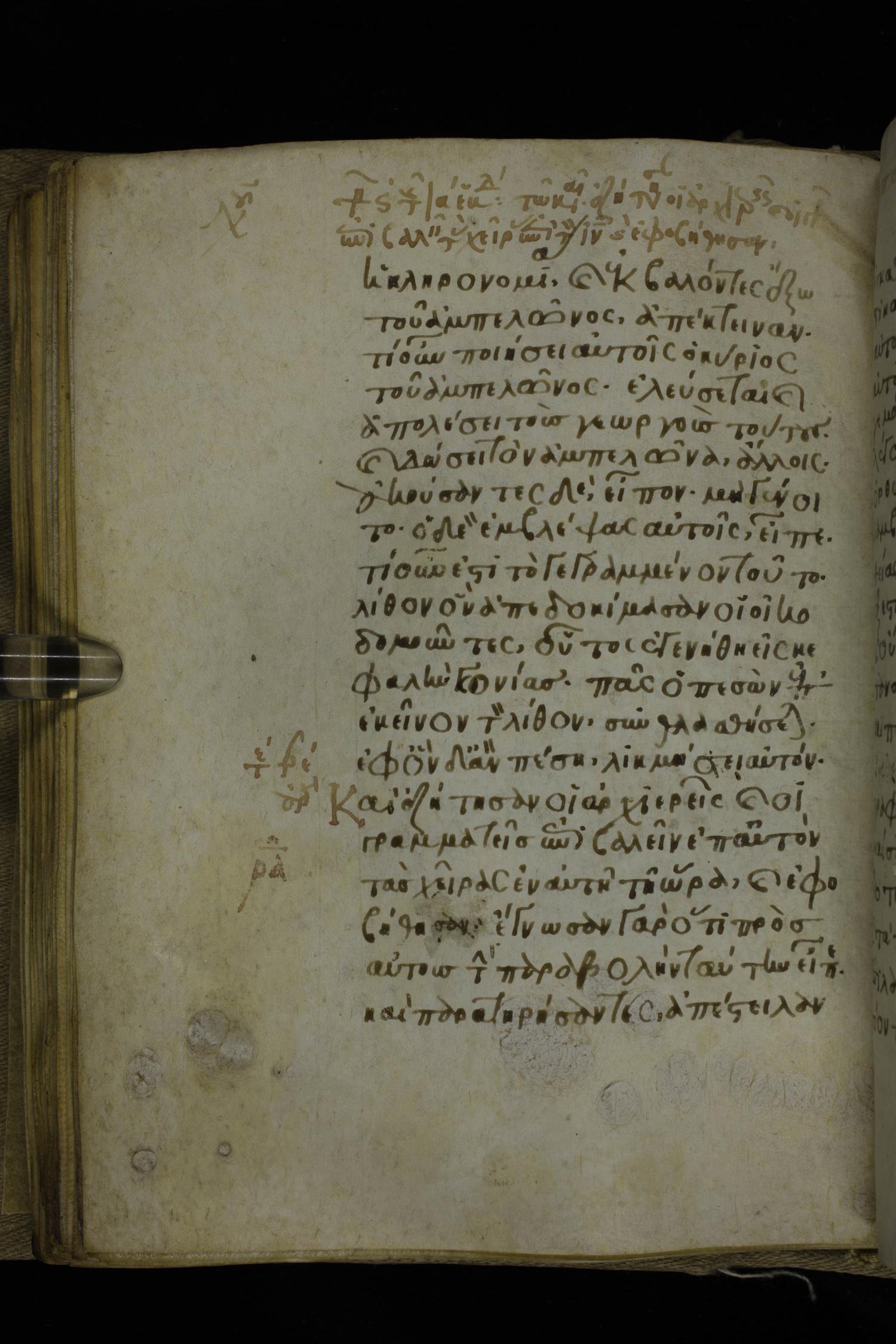 Fourteenth century minuscule of the Gospels on parchment; 302 leaves, 1 column, 19-21 lines per column. Images were taken at the National Library of Greece in Athens.