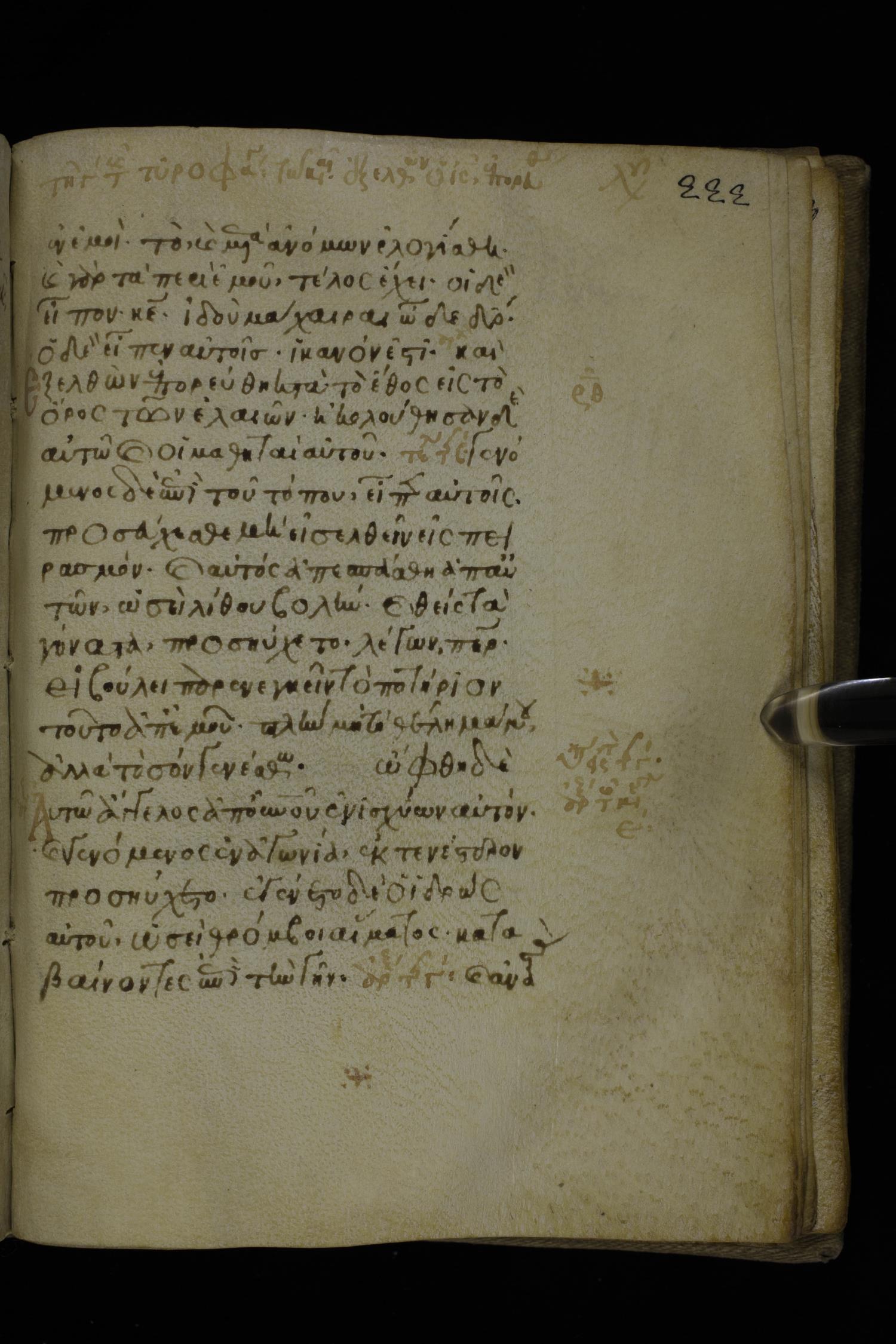 Fourteenth century minuscule of the Gospels on parchment; 302 leaves, 1 column, 19-21 lines per column. Images were taken at the National Library of Greece in Athens.