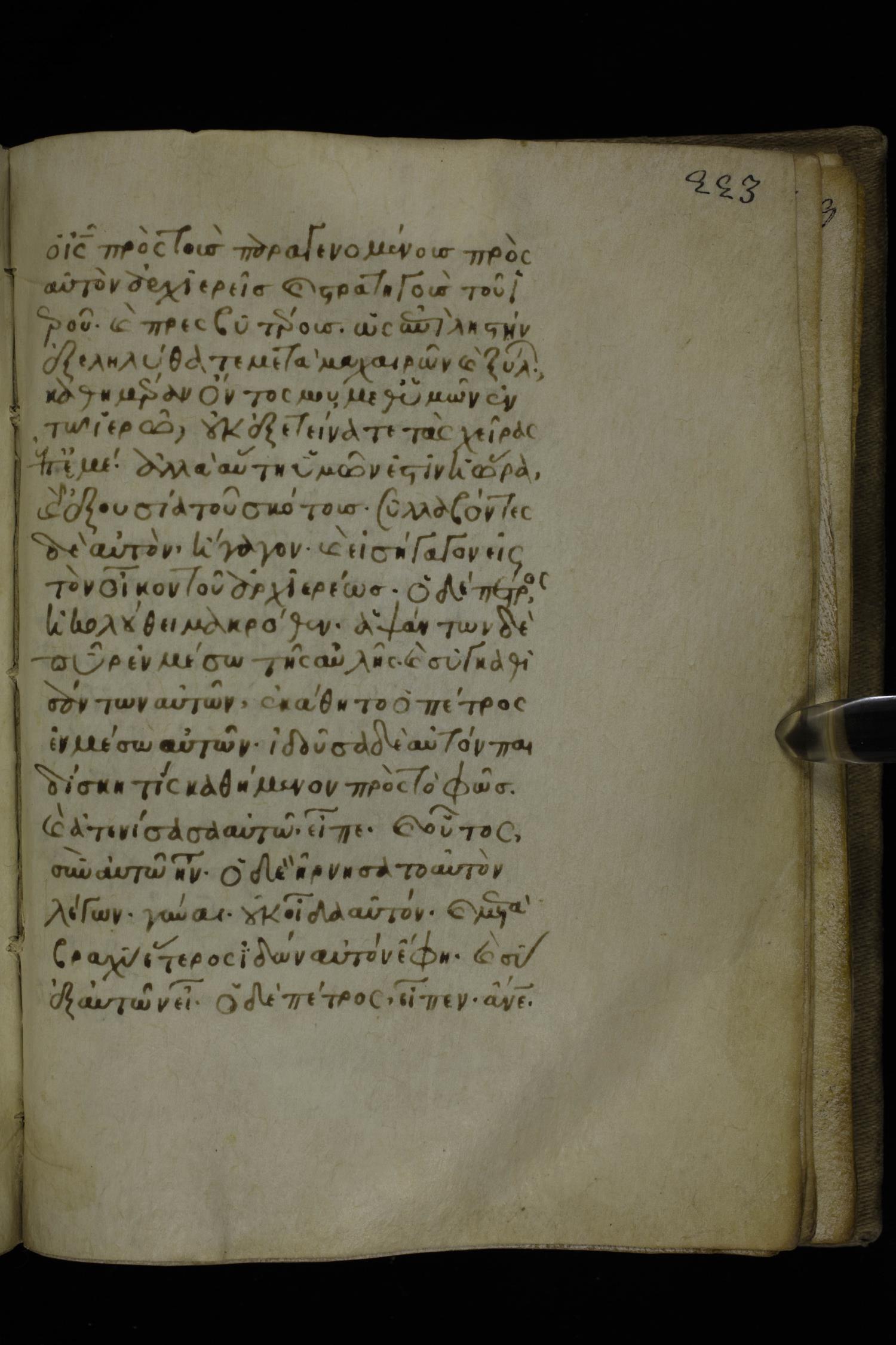 Fourteenth century minuscule of the Gospels on parchment; 302 leaves, 1 column, 19-21 lines per column. Images were taken at the National Library of Greece in Athens.