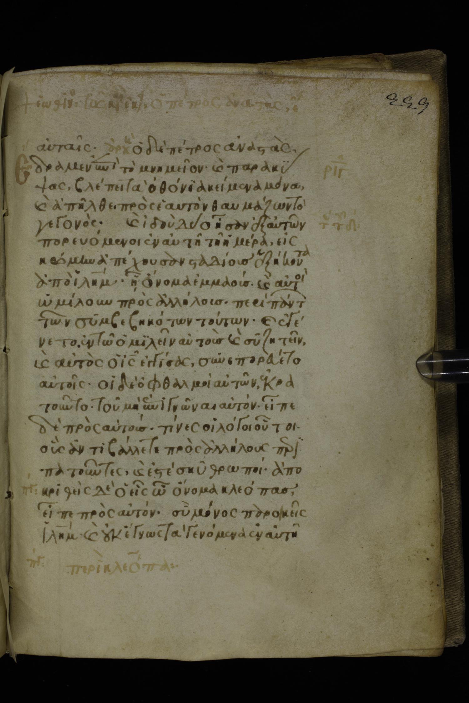 Fourteenth century minuscule of the Gospels on parchment; 302 leaves, 1 column, 19-21 lines per column. Images were taken at the National Library of Greece in Athens.