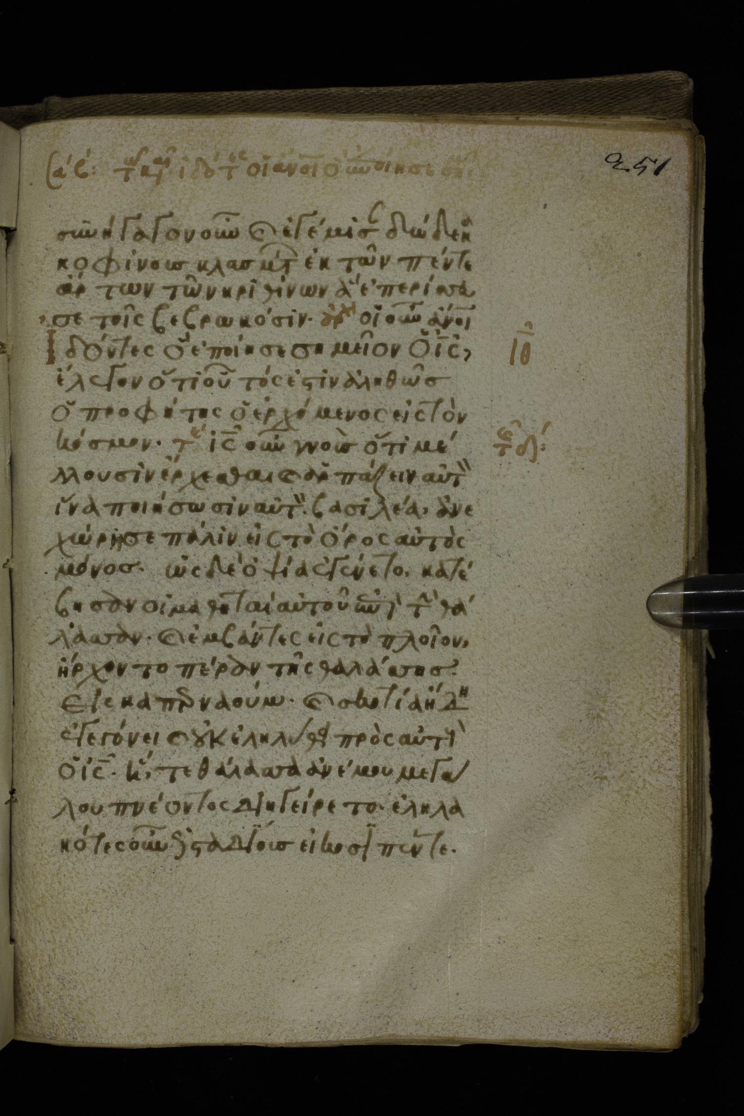 Fourteenth century minuscule of the Gospels on parchment; 302 leaves, 1 column, 19-21 lines per column. Images were taken at the National Library of Greece in Athens.