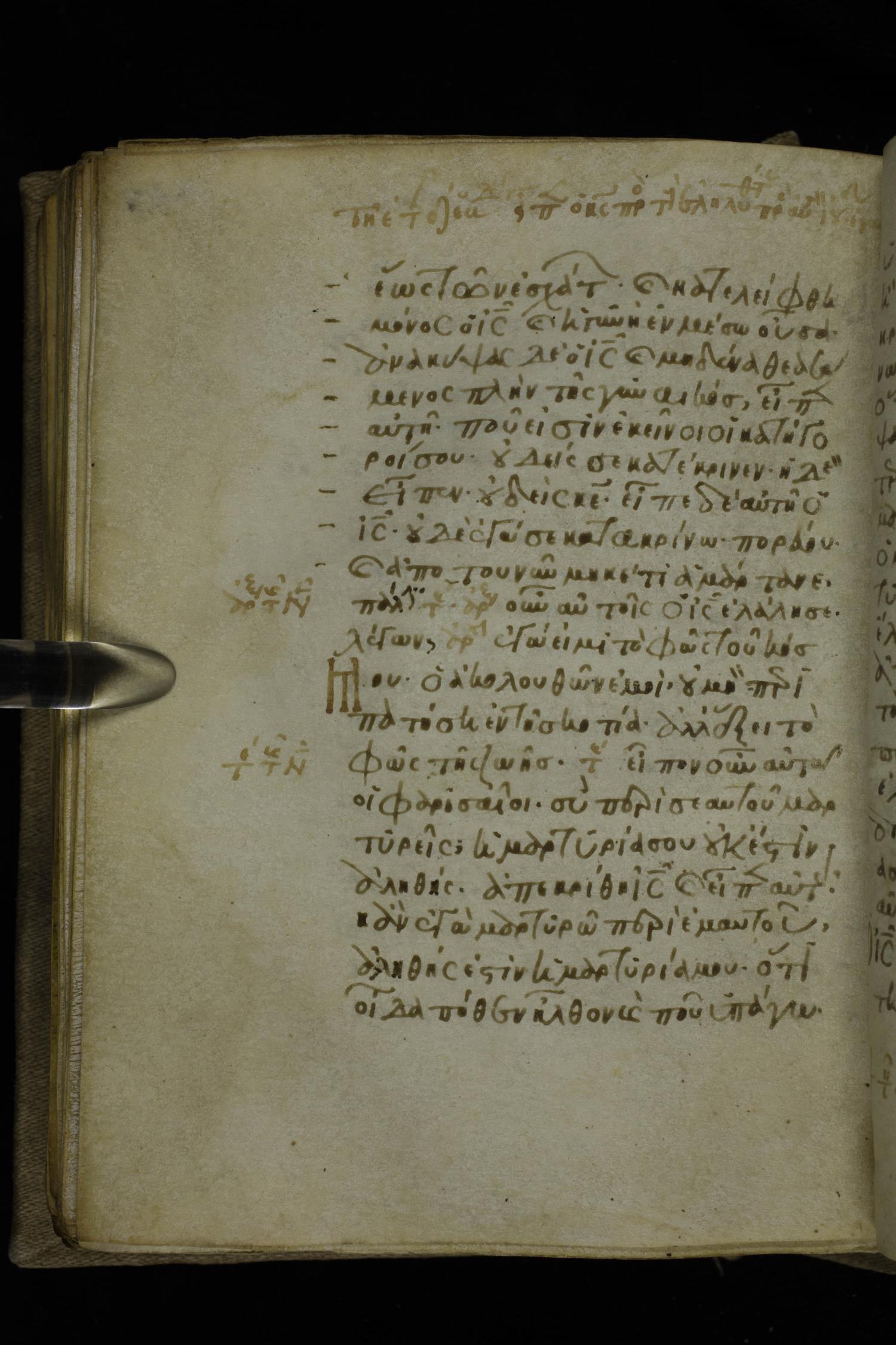 Fourteenth century minuscule of the Gospels on parchment; 302 leaves, 1 column, 19-21 lines per column. Images were taken at the National Library of Greece in Athens.