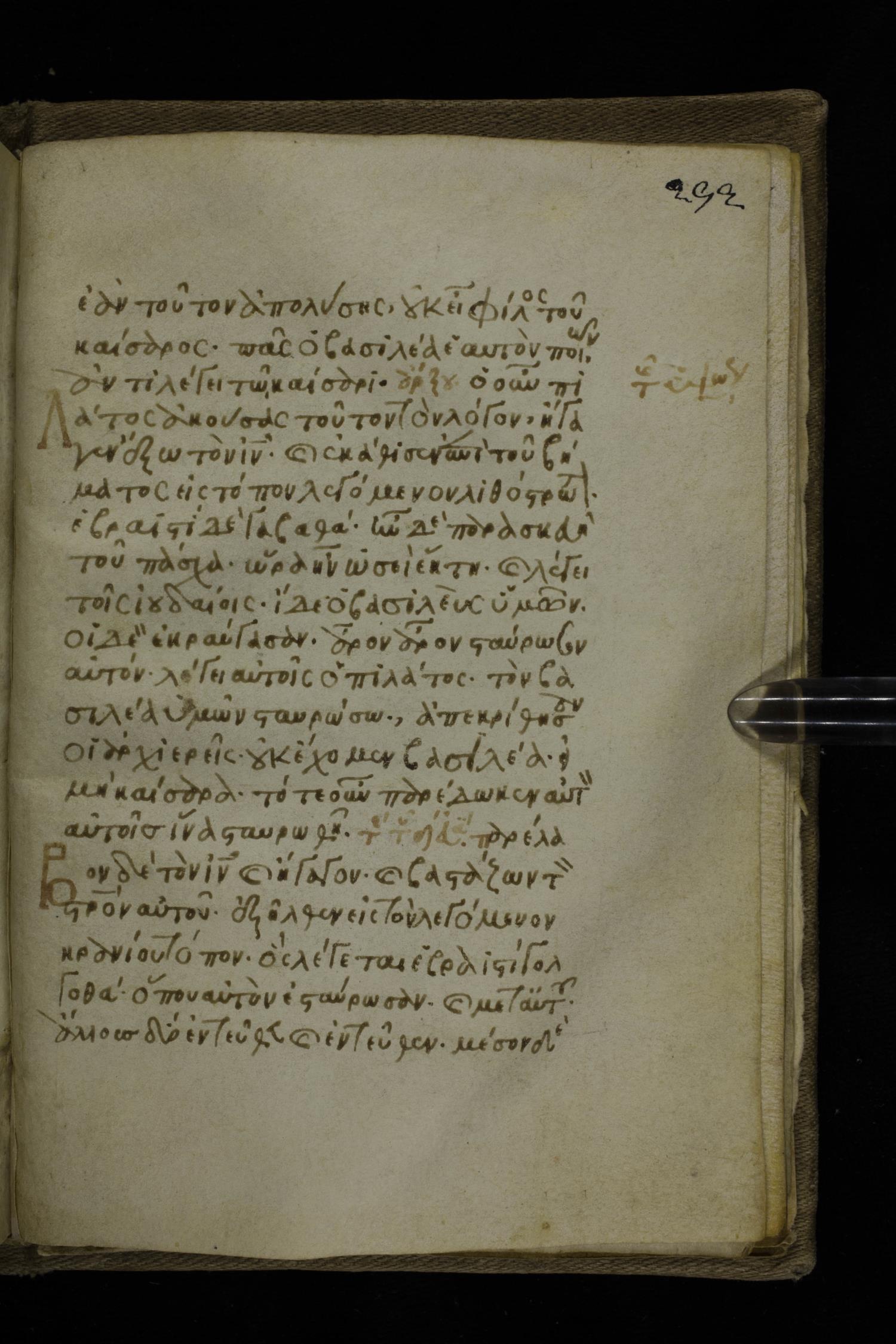 Fourteenth century minuscule of the Gospels on parchment; 302 leaves, 1 column, 19-21 lines per column. Images were taken at the National Library of Greece in Athens.