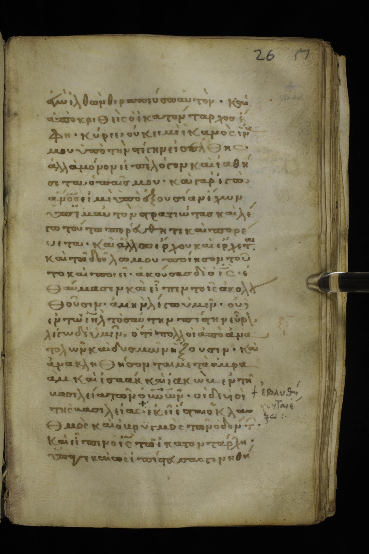 Thirteenth century minuscule of the Gospels on parchment; 298 leaves, 1 column, 22-24 lines per column. Images were taken at the National Library of Greece in Athens.
