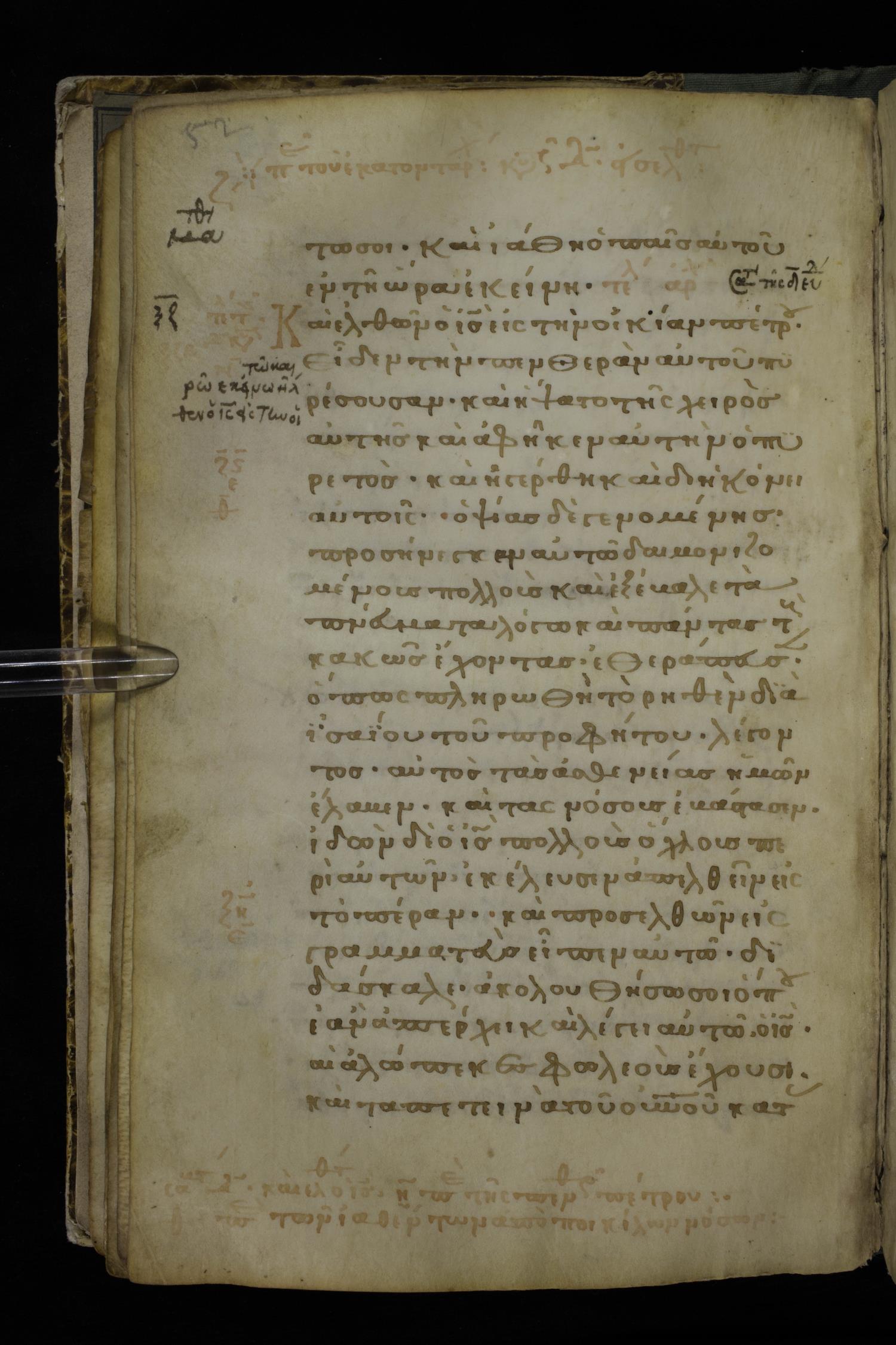 Thirteenth century minuscule of the Gospels on parchment; 298 leaves, 1 column, 22-24 lines per column. Images were taken at the National Library of Greece in Athens.