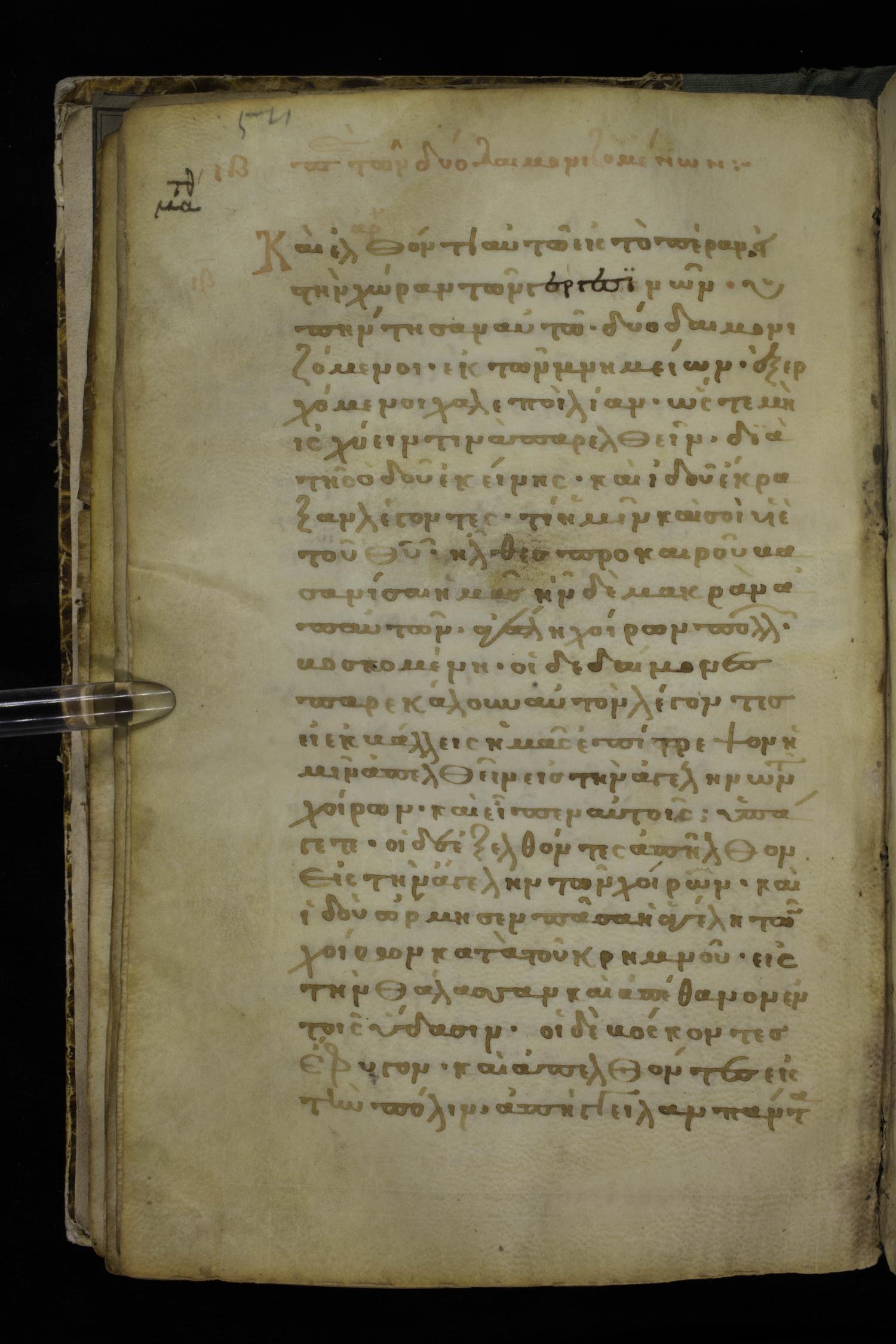 Thirteenth century minuscule of the Gospels on parchment; 298 leaves, 1 column, 22-24 lines per column. Images were taken at the National Library of Greece in Athens.