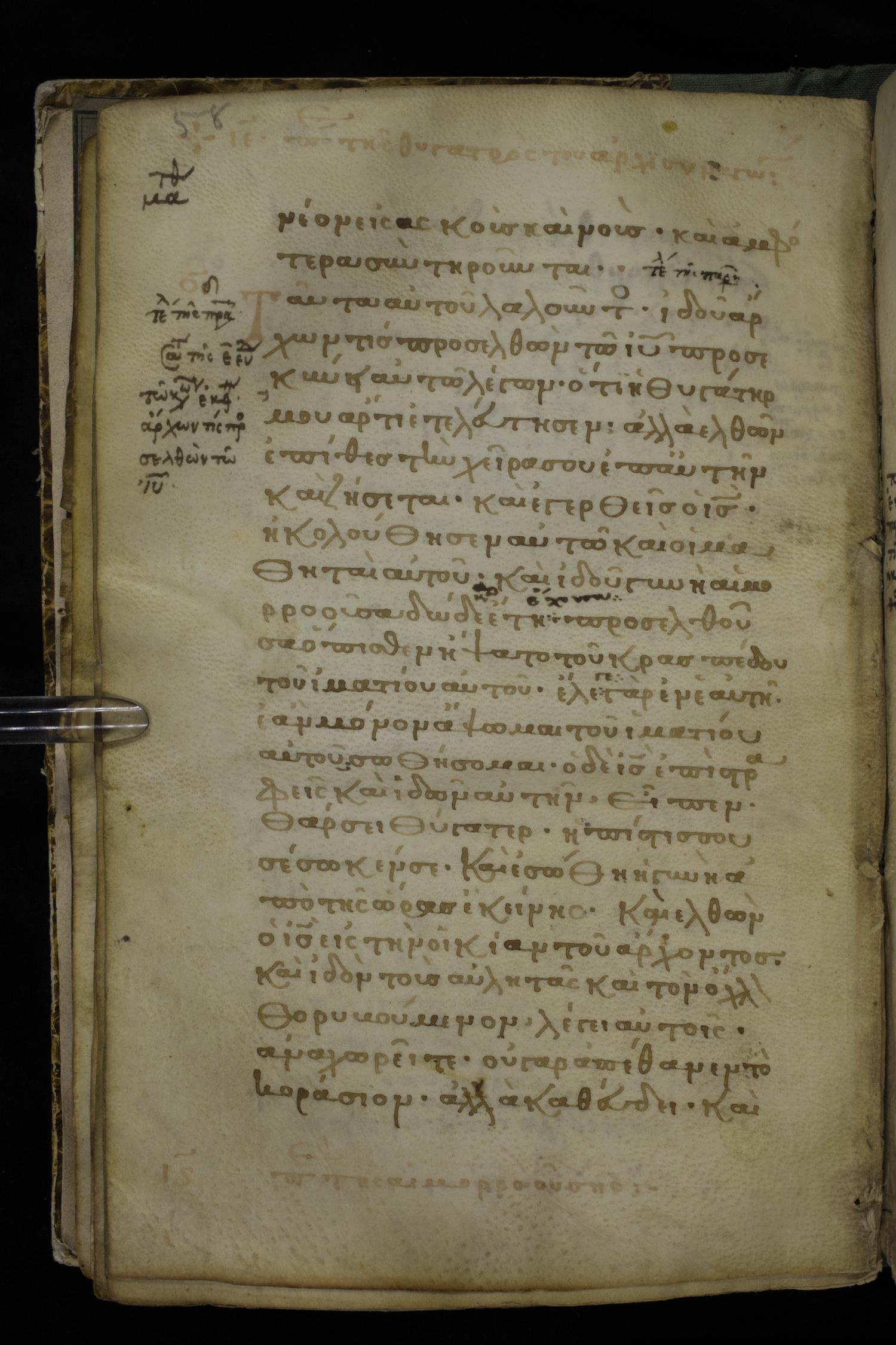 Thirteenth century minuscule of the Gospels on parchment; 298 leaves, 1 column, 22-24 lines per column. Images were taken at the National Library of Greece in Athens.