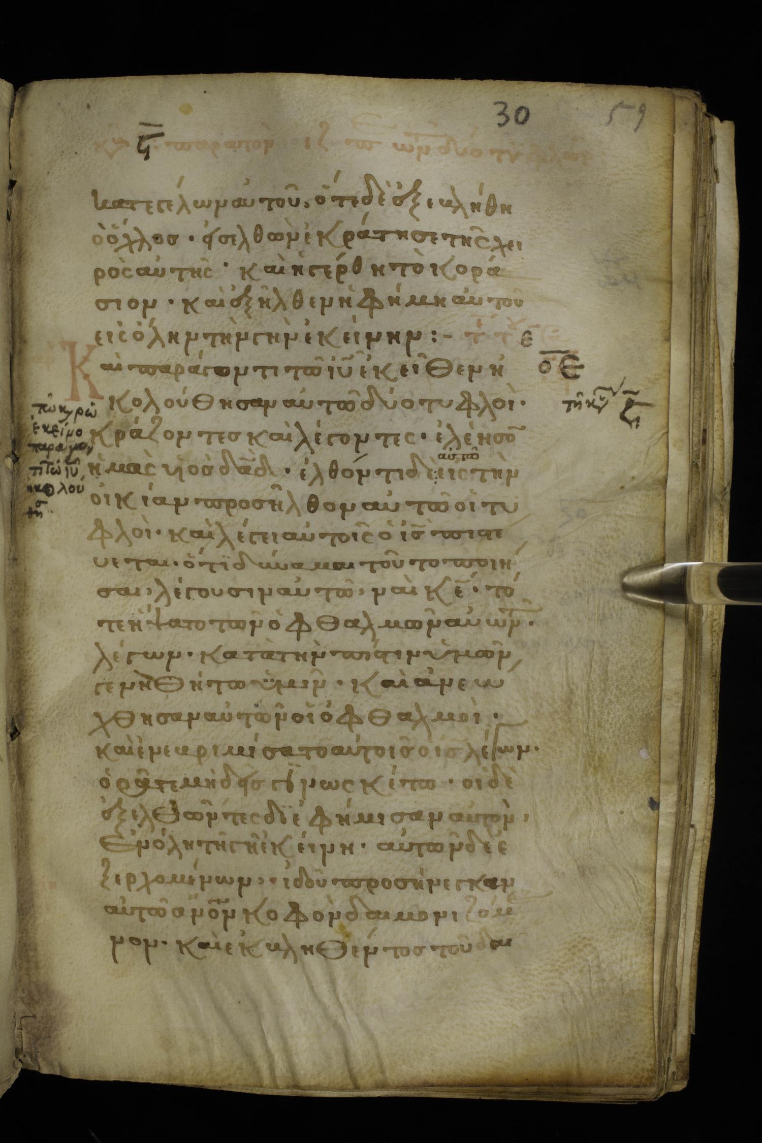 Thirteenth century minuscule of the Gospels on parchment; 298 leaves, 1 column, 22-24 lines per column. Images were taken at the National Library of Greece in Athens.