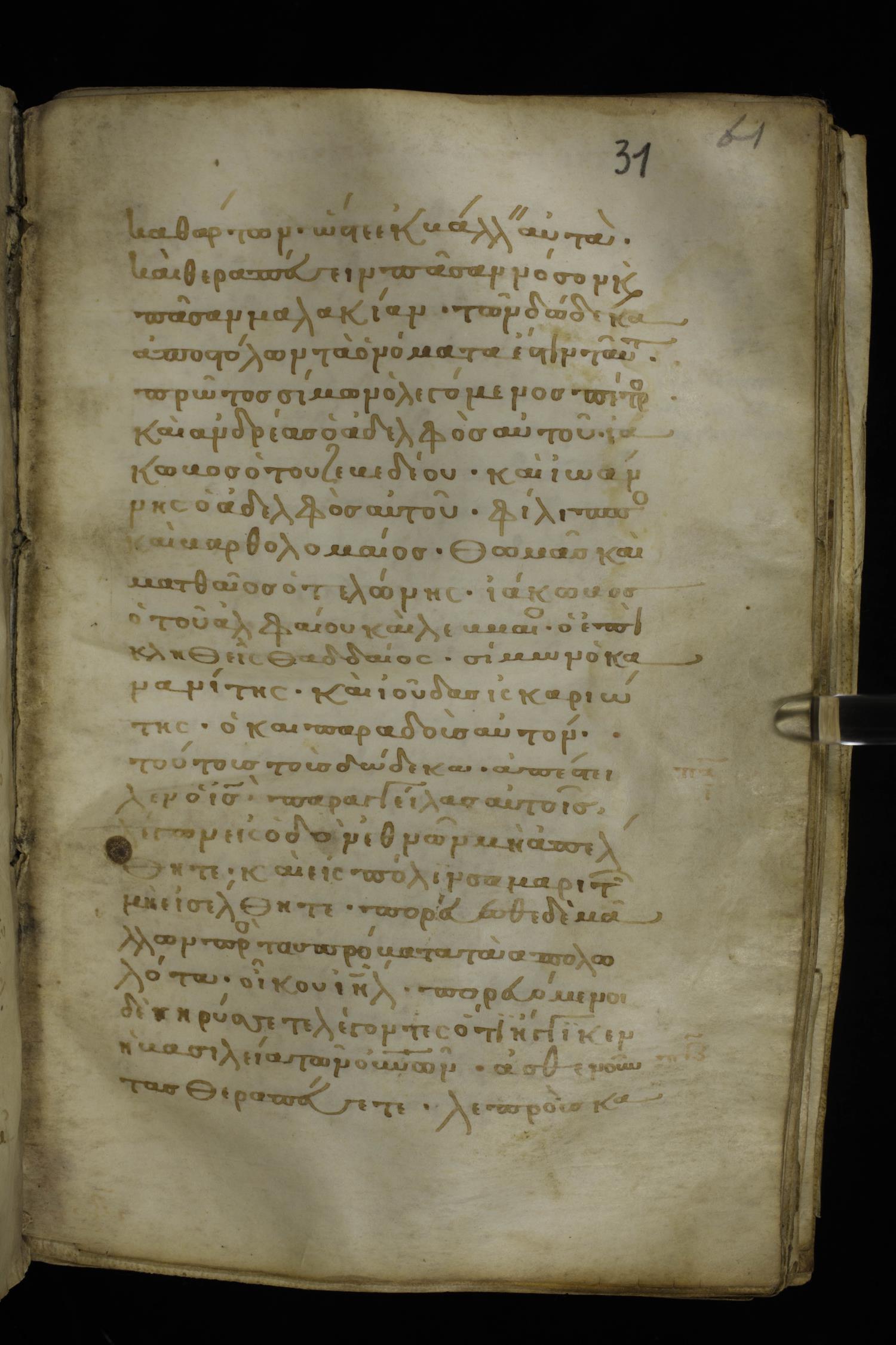 Thirteenth century minuscule of the Gospels on parchment; 298 leaves, 1 column, 22-24 lines per column. Images were taken at the National Library of Greece in Athens.