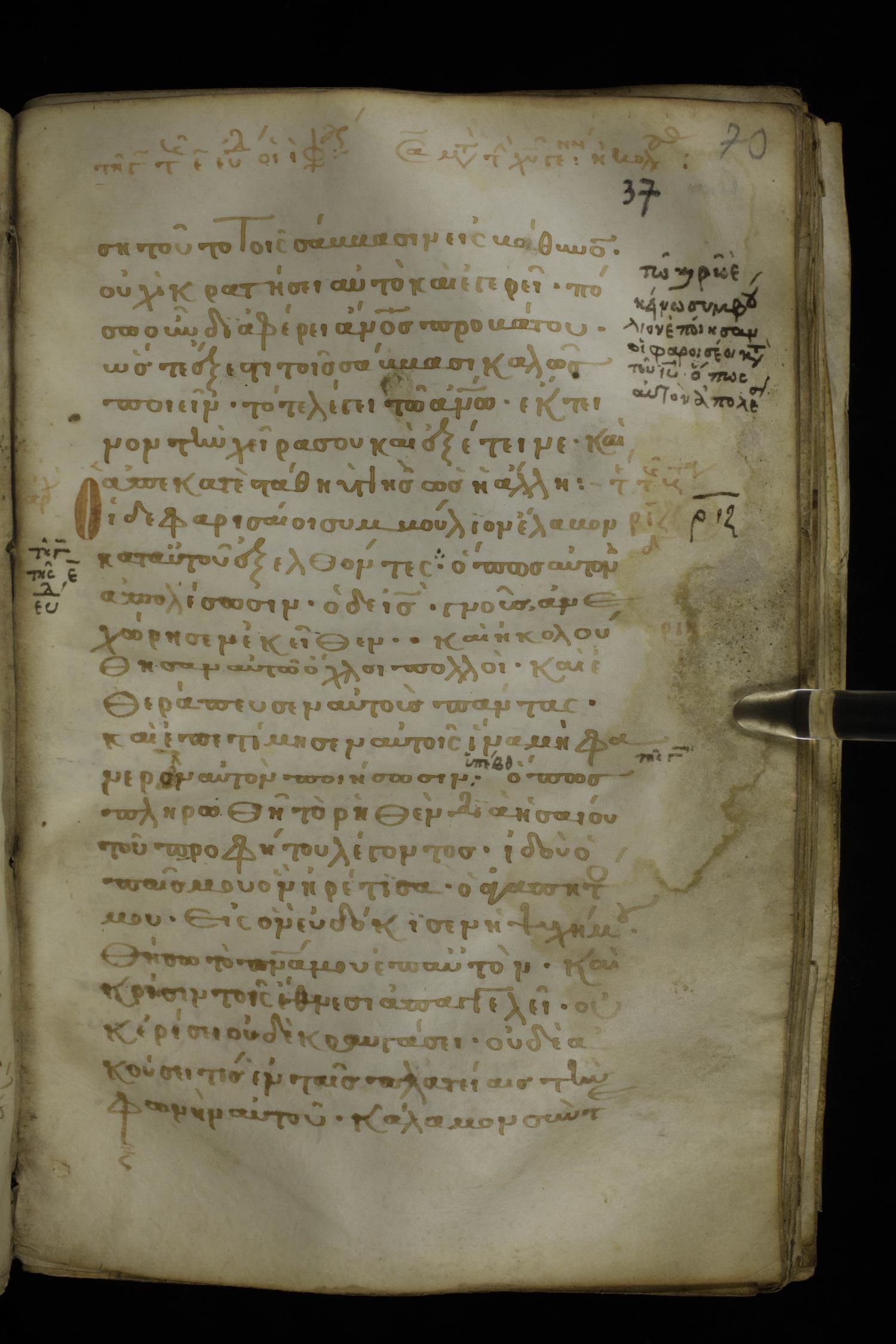 Thirteenth century minuscule of the Gospels on parchment; 298 leaves, 1 column, 22-24 lines per column. Images were taken at the National Library of Greece in Athens.