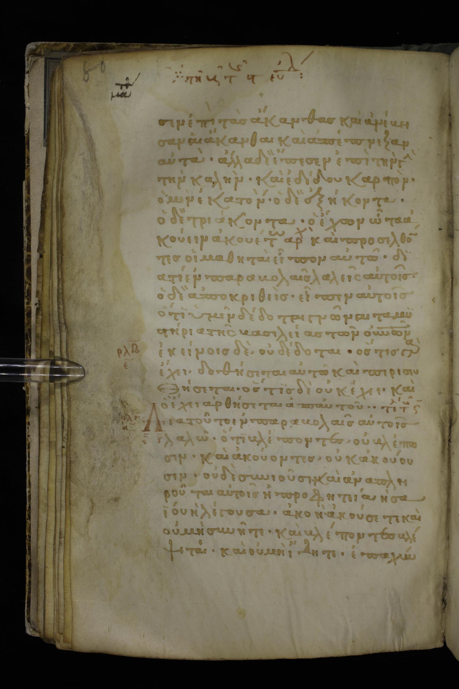 Thirteenth century minuscule of the Gospels on parchment; 298 leaves, 1 column, 22-24 lines per column. Images were taken at the National Library of Greece in Athens.
