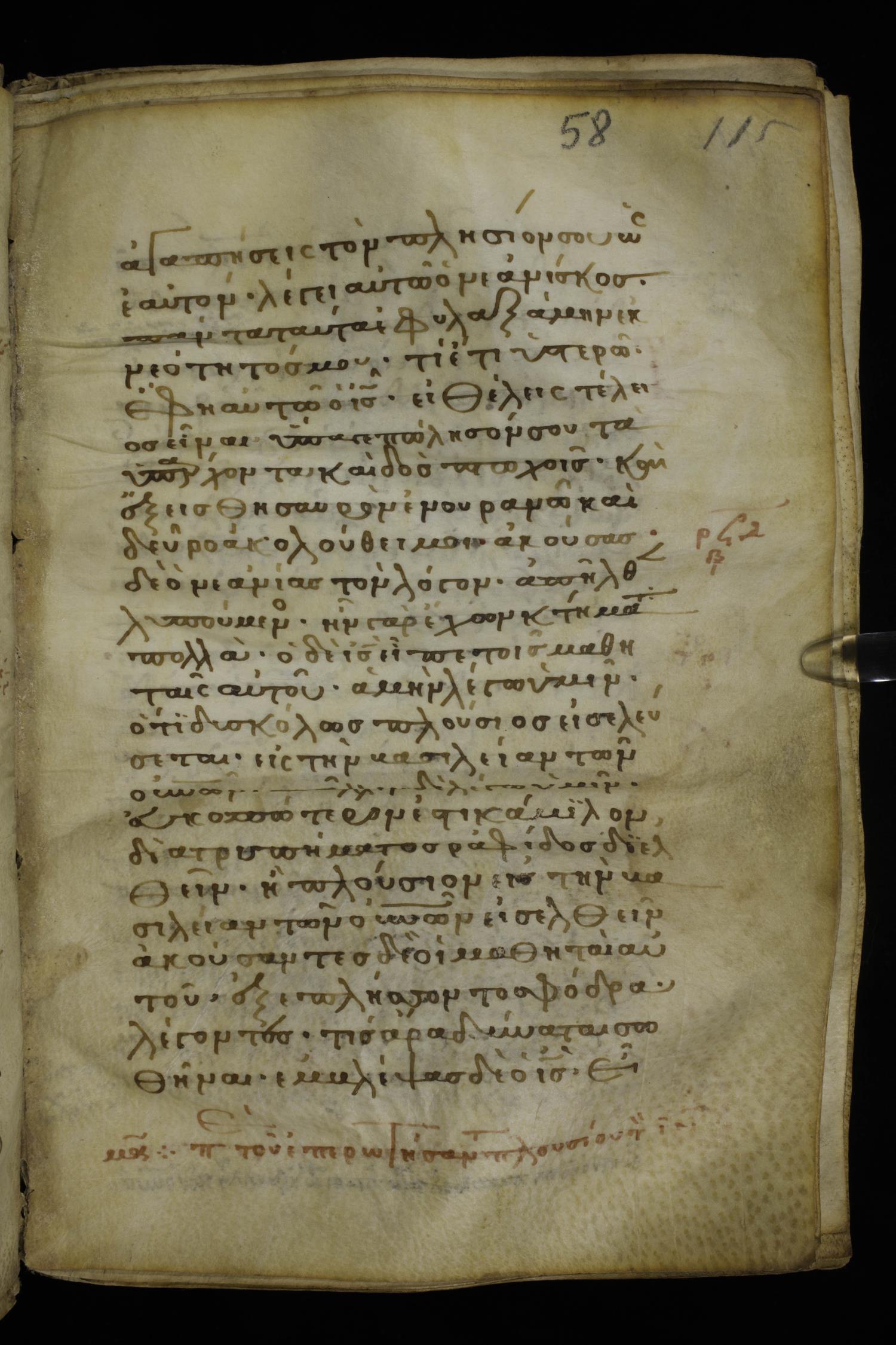 Thirteenth century minuscule of the Gospels on parchment; 298 leaves, 1 column, 22-24 lines per column. Images were taken at the National Library of Greece in Athens.