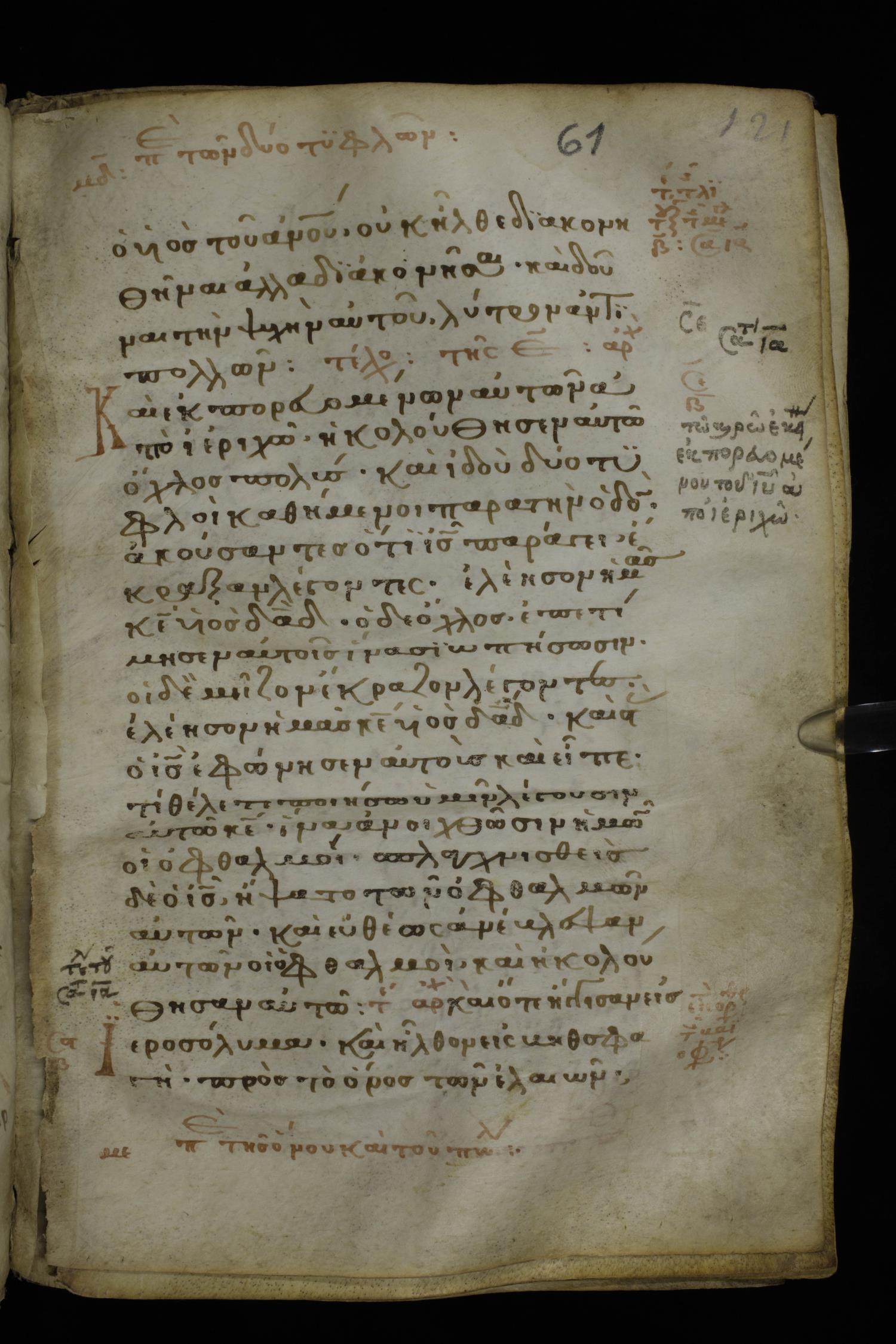 Thirteenth century minuscule of the Gospels on parchment; 298 leaves, 1 column, 22-24 lines per column. Images were taken at the National Library of Greece in Athens.