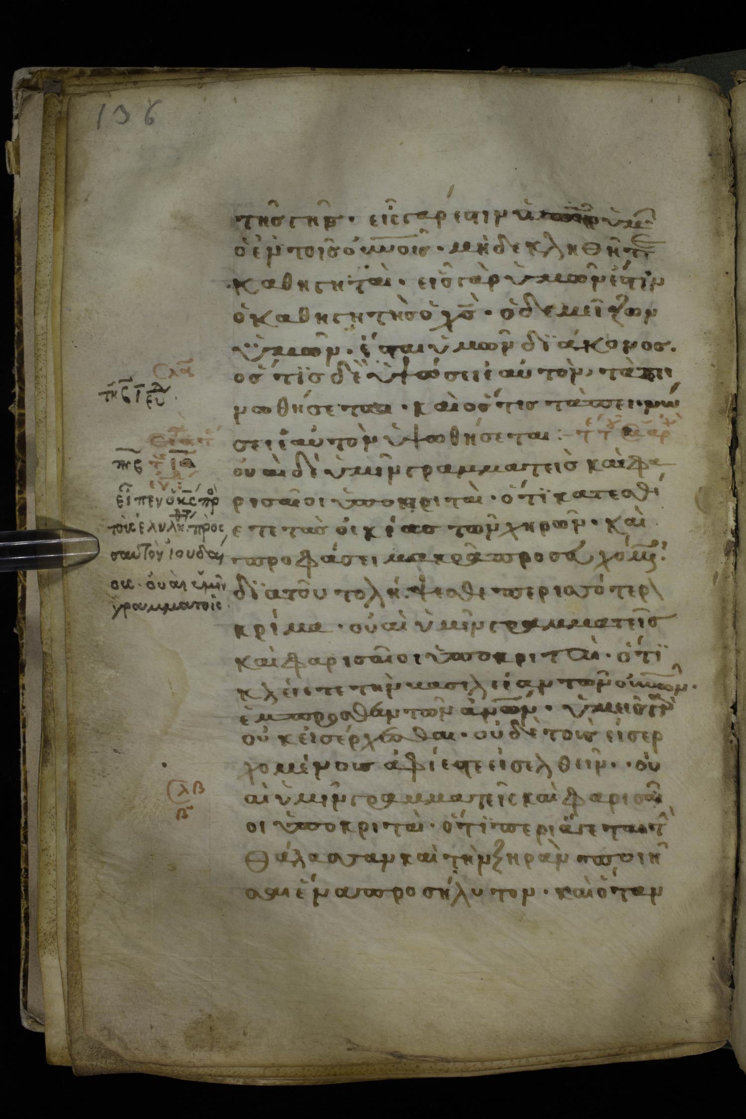 Thirteenth century minuscule of the Gospels on parchment; 298 leaves, 1 column, 22-24 lines per column. Images were taken at the National Library of Greece in Athens.
