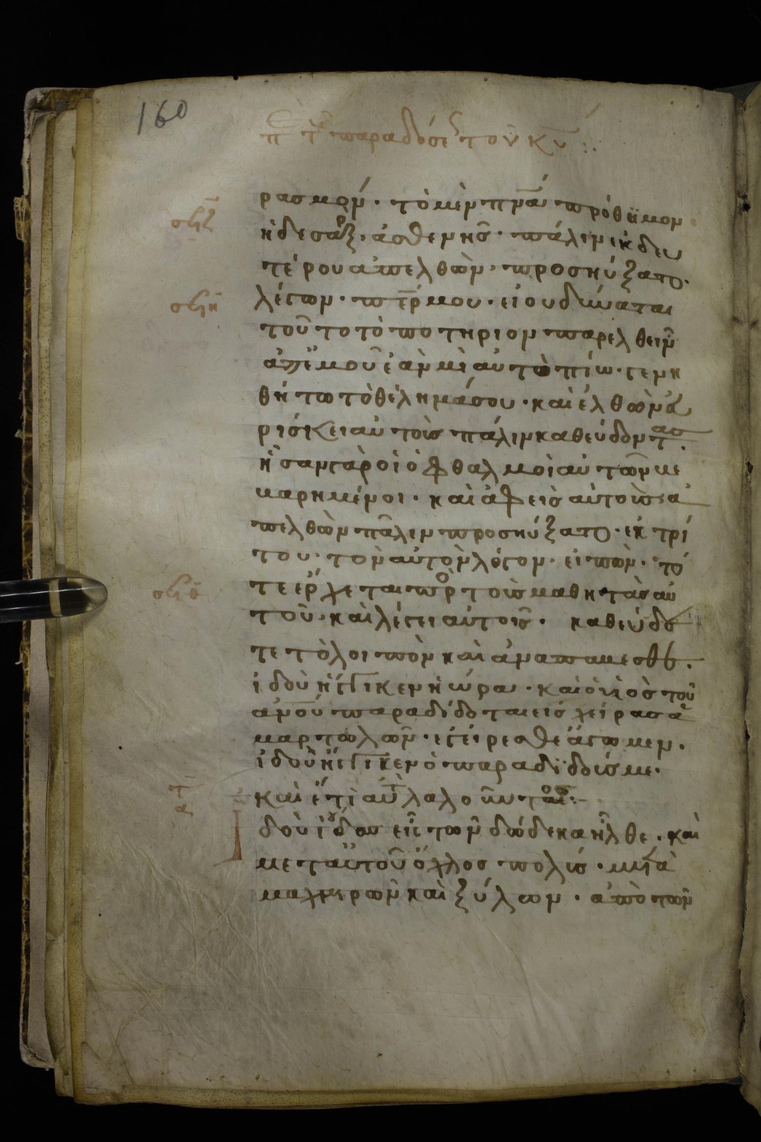 Thirteenth century minuscule of the Gospels on parchment; 298 leaves, 1 column, 22-24 lines per column. Images were taken at the National Library of Greece in Athens.