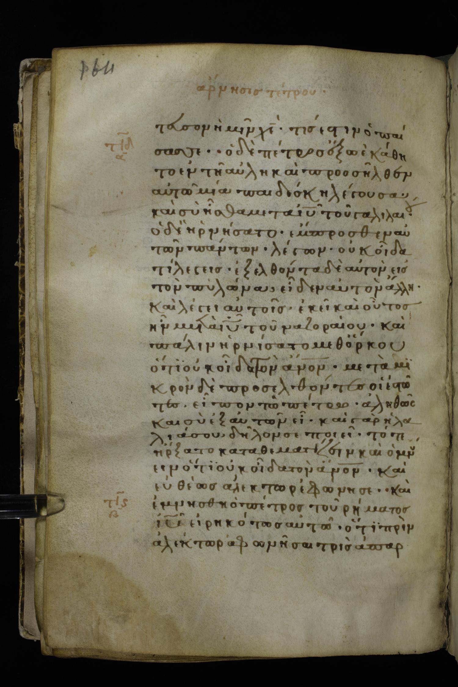 Thirteenth century minuscule of the Gospels on parchment; 298 leaves, 1 column, 22-24 lines per column. Images were taken at the National Library of Greece in Athens.